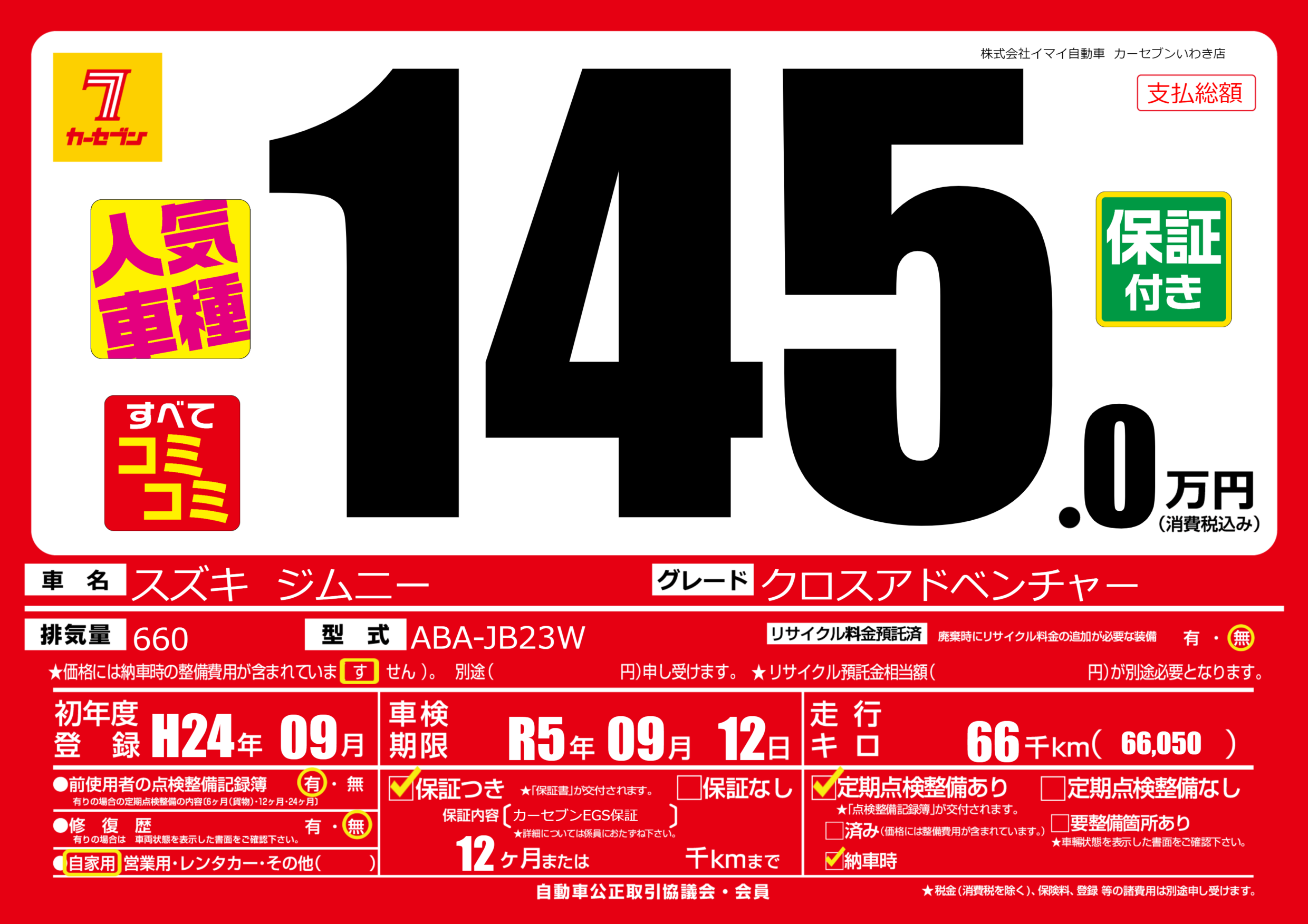 保証付き 保証内容(カーセブンEGS保証) 12ヶ月または千km |