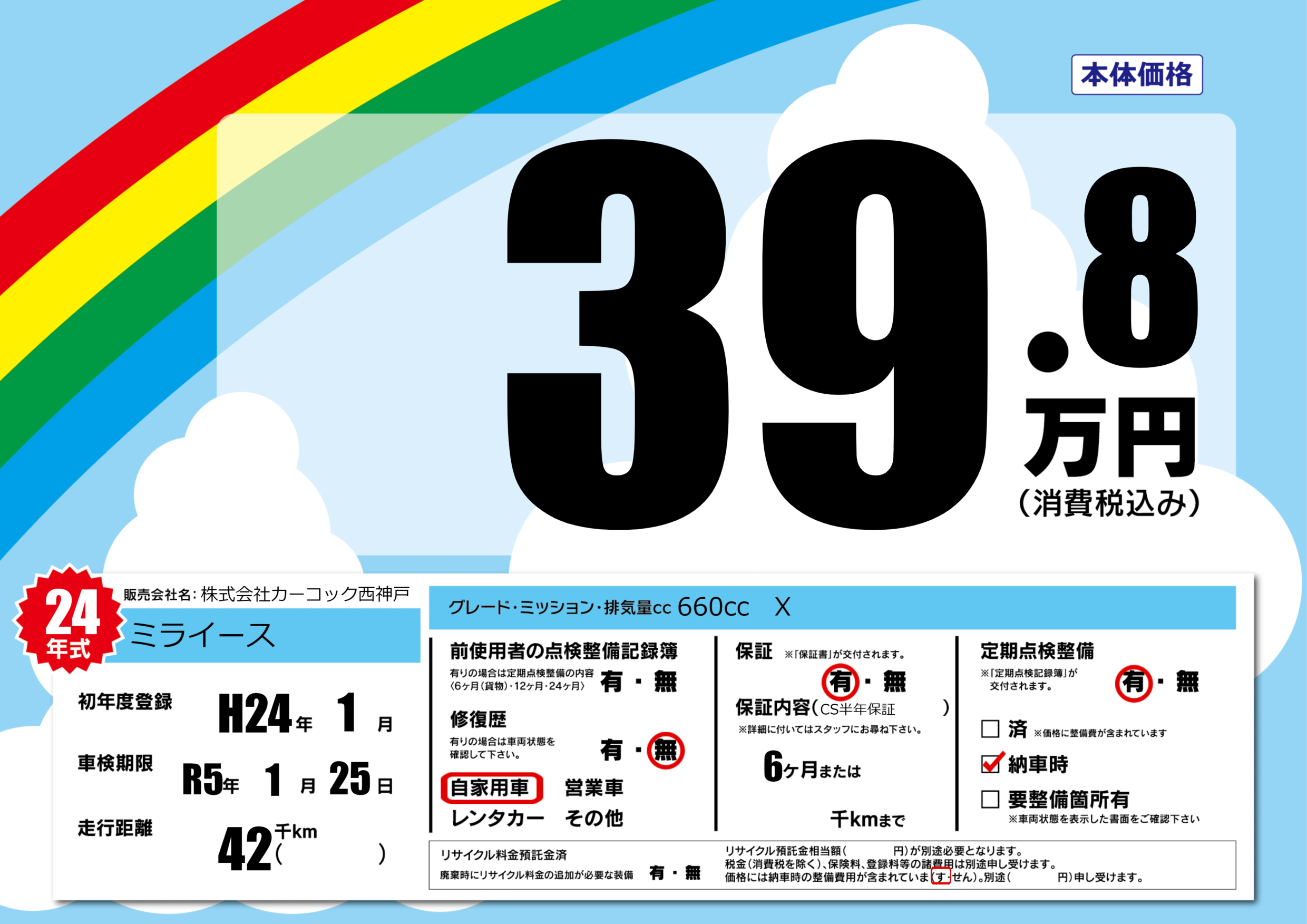 | 走行キロ | 4.2万km | 初年度登録 | H24年1月 |