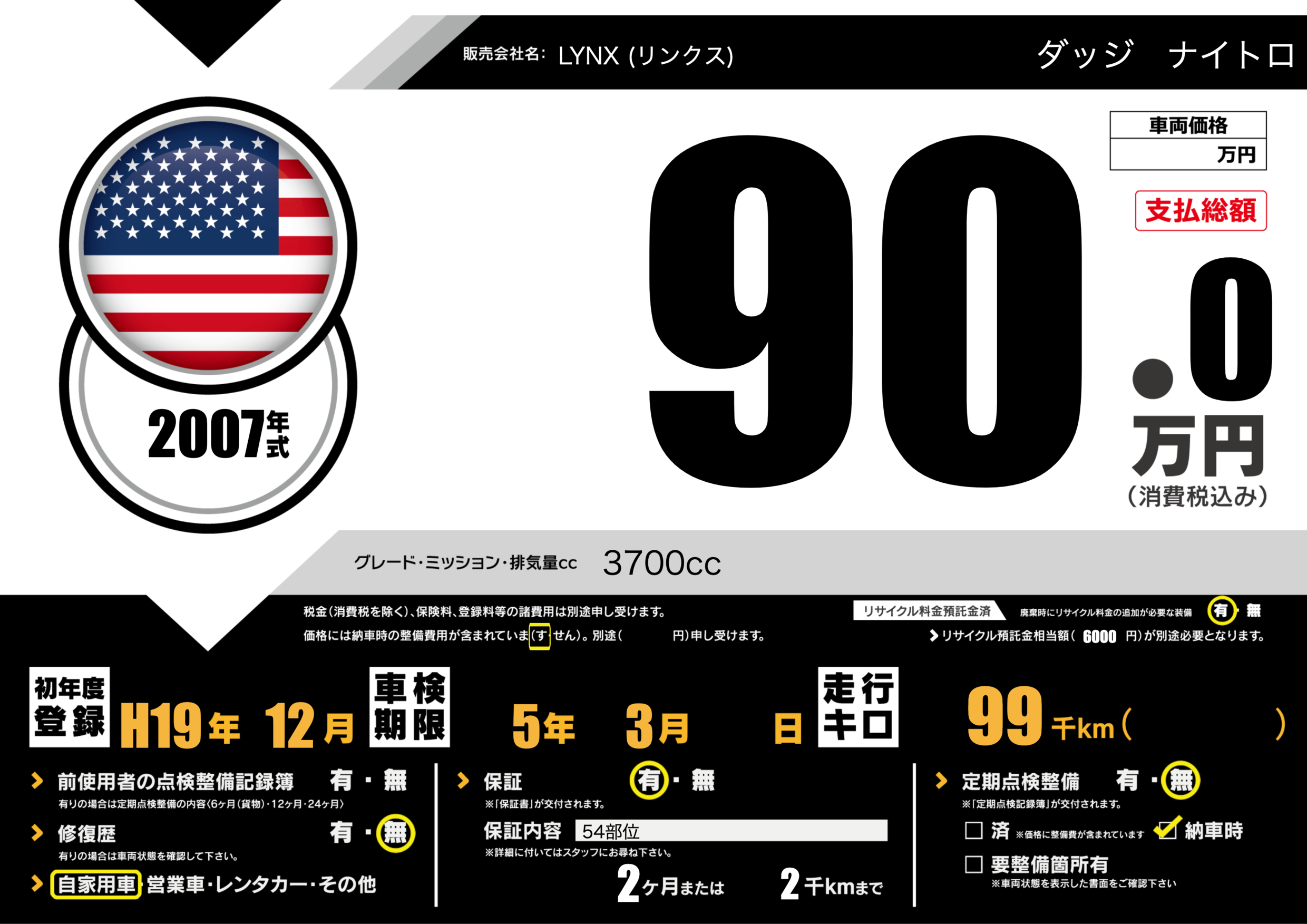 | 車名 | ダッジ ナイトロ | グレード ミッション 排気量 |