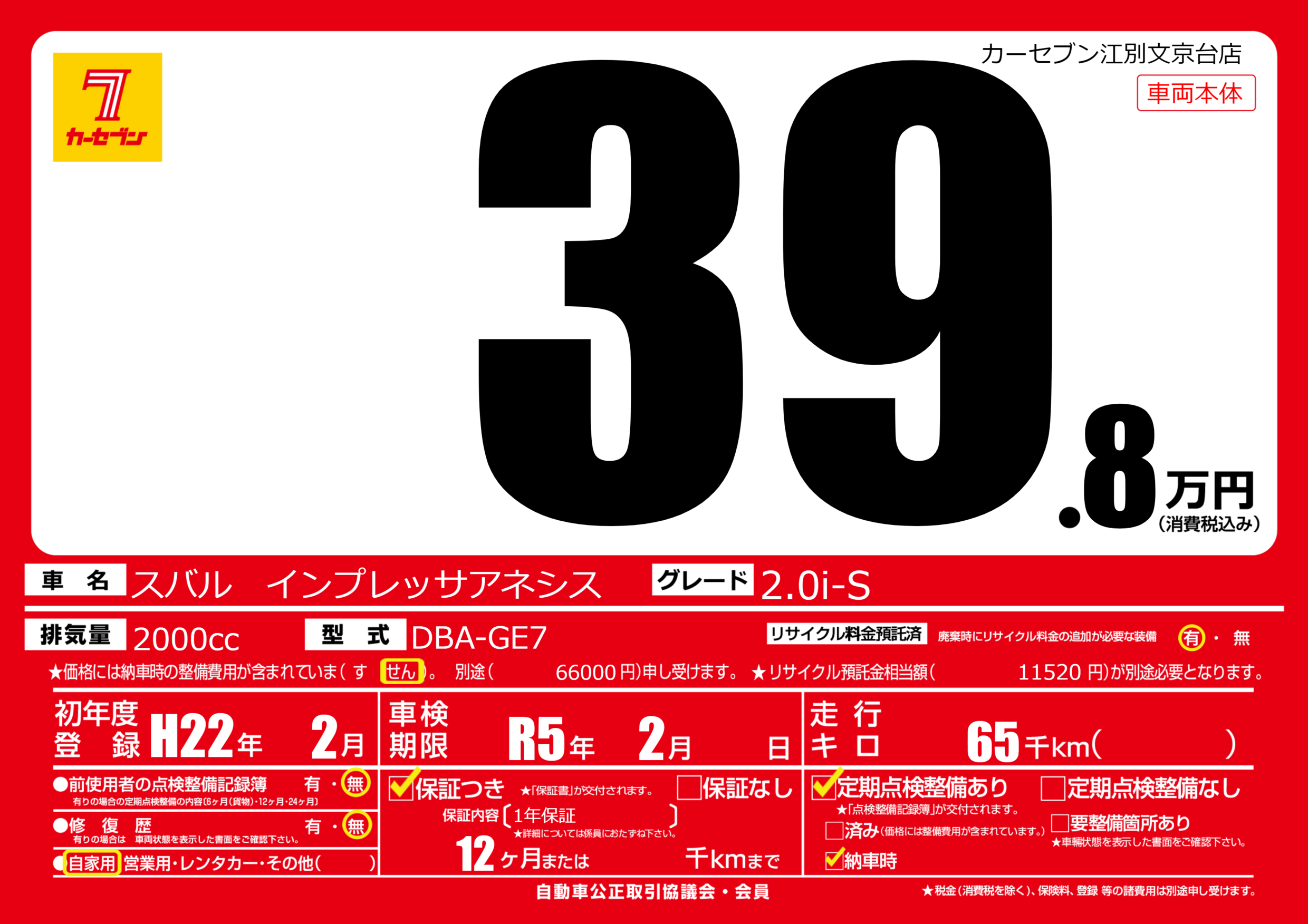 | 車名 | スバル インプレッサアネシス | グレード ミッション 排気量 |