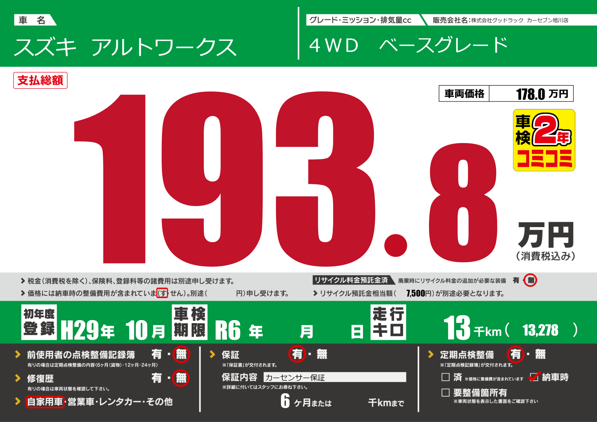 保証付き 保証内容(カーセンサー保証) 6ヶ月または()千kmまで |