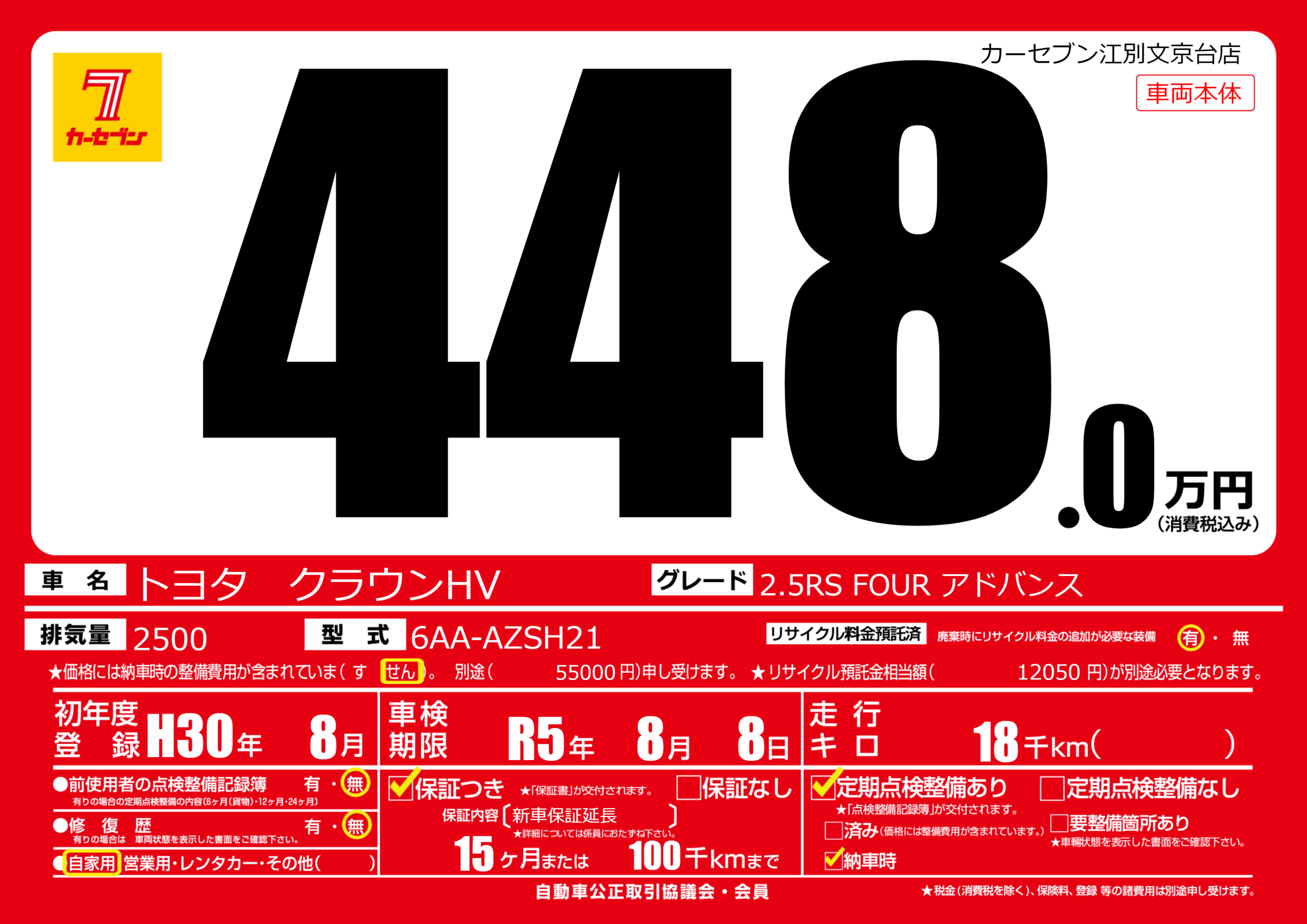 | 車名 | トヨタ クラウンHV | グレード ミッション 排気量 |