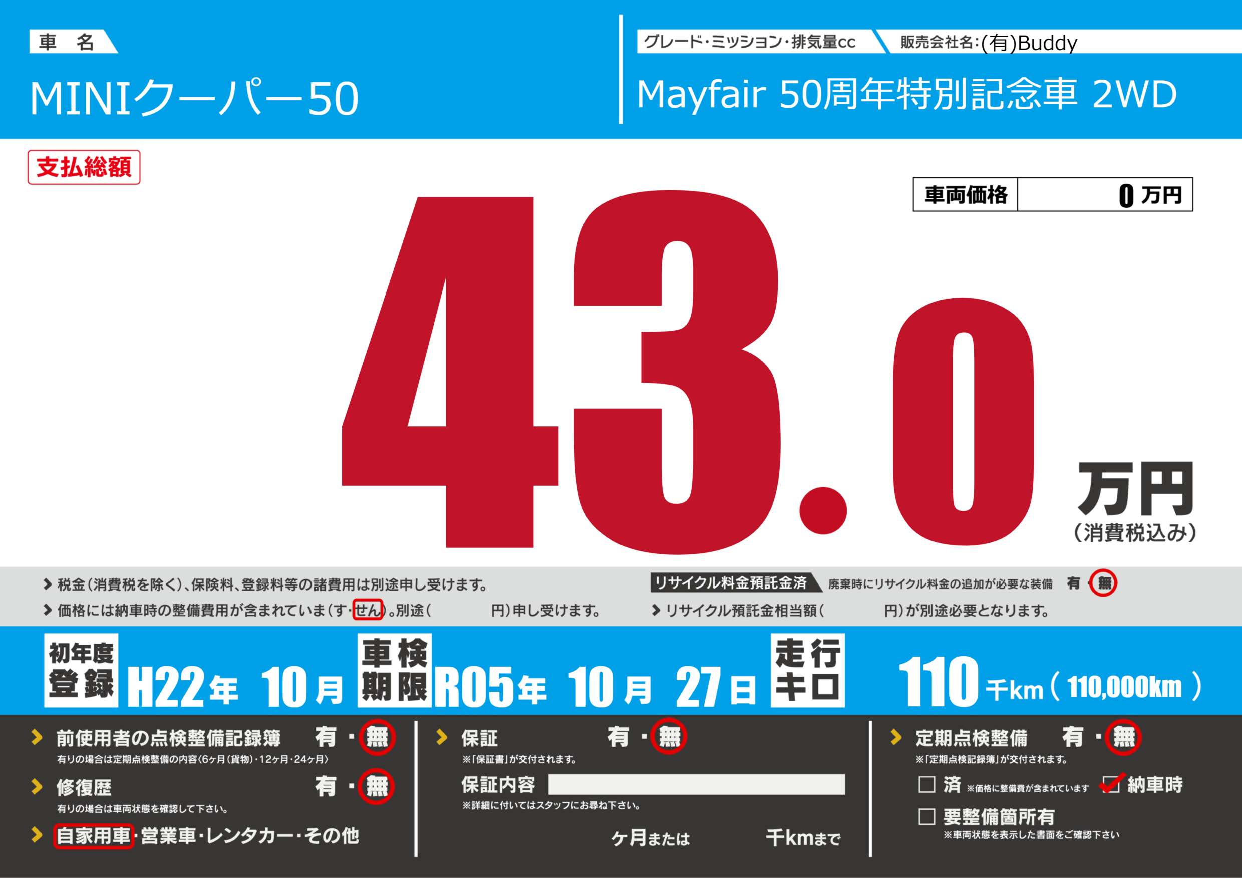 | 車名 | MINIクーパー50 | グレード ミッション 排気量 |