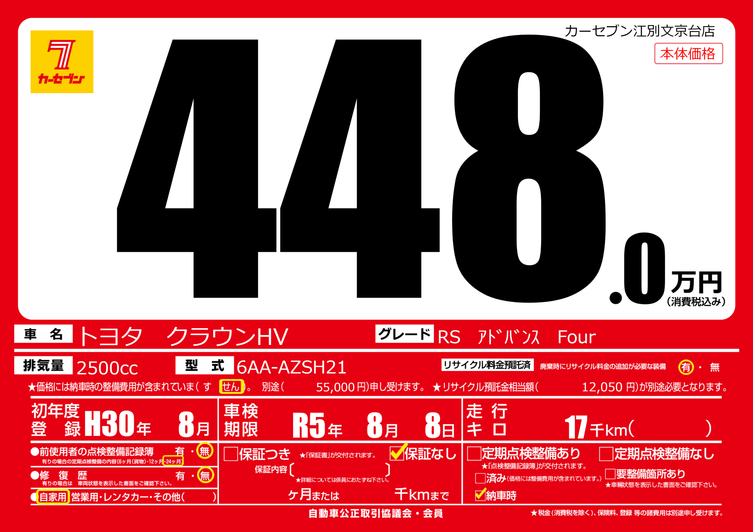 | 車名 | トヨタ クラウンHV | グレード ミッション 排気量 |