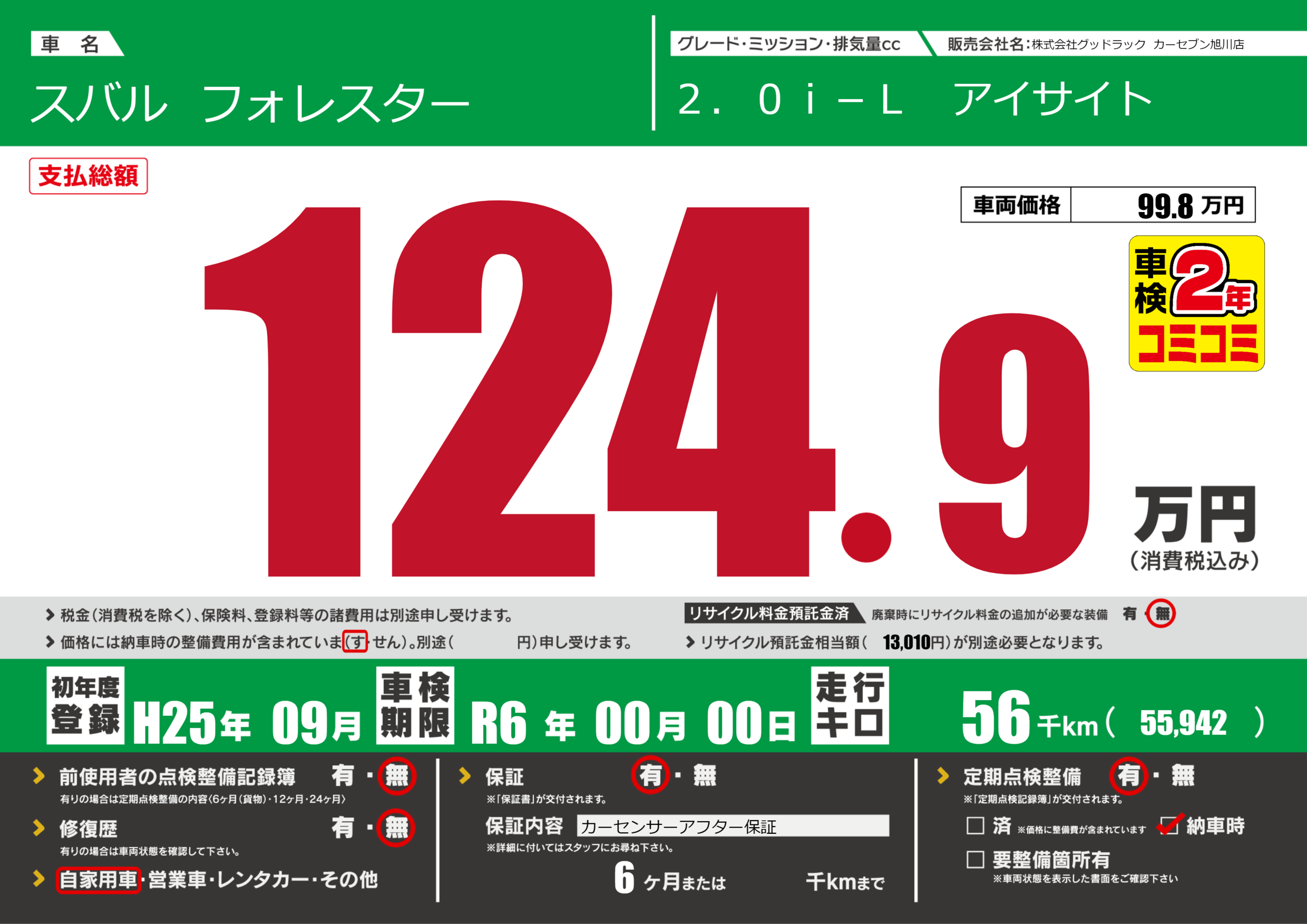 | 車名 | スバル フォレスター | グレード ミッション 排気量 |