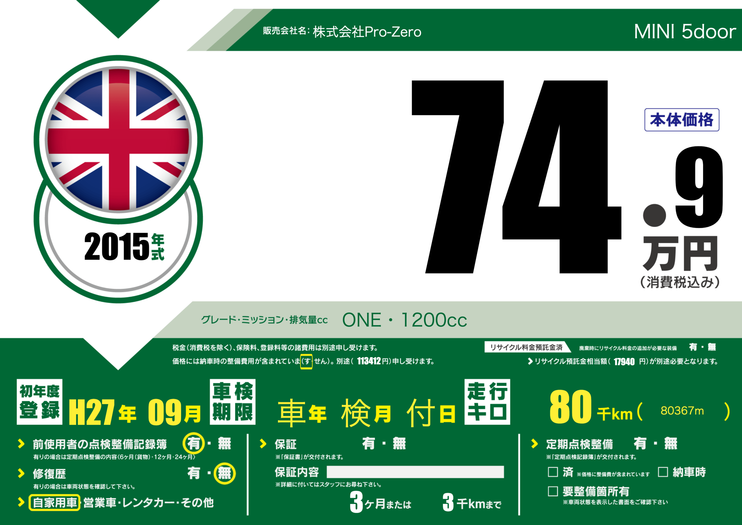 | 車名 | MINI 5door | グレード ミッション 排気量 |