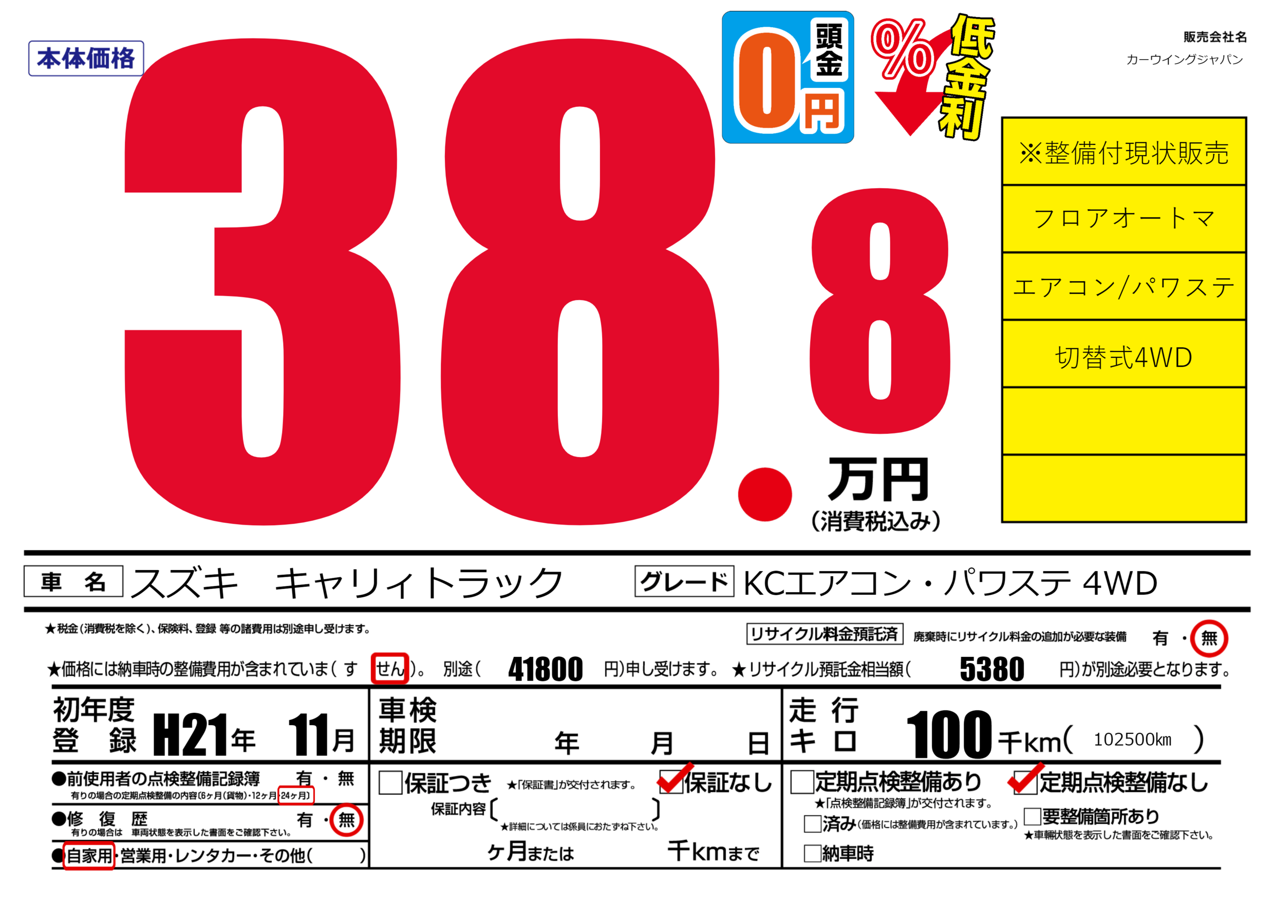 | 車名 | スズキ キャリィトラック | グレード ミッション 排気量 |