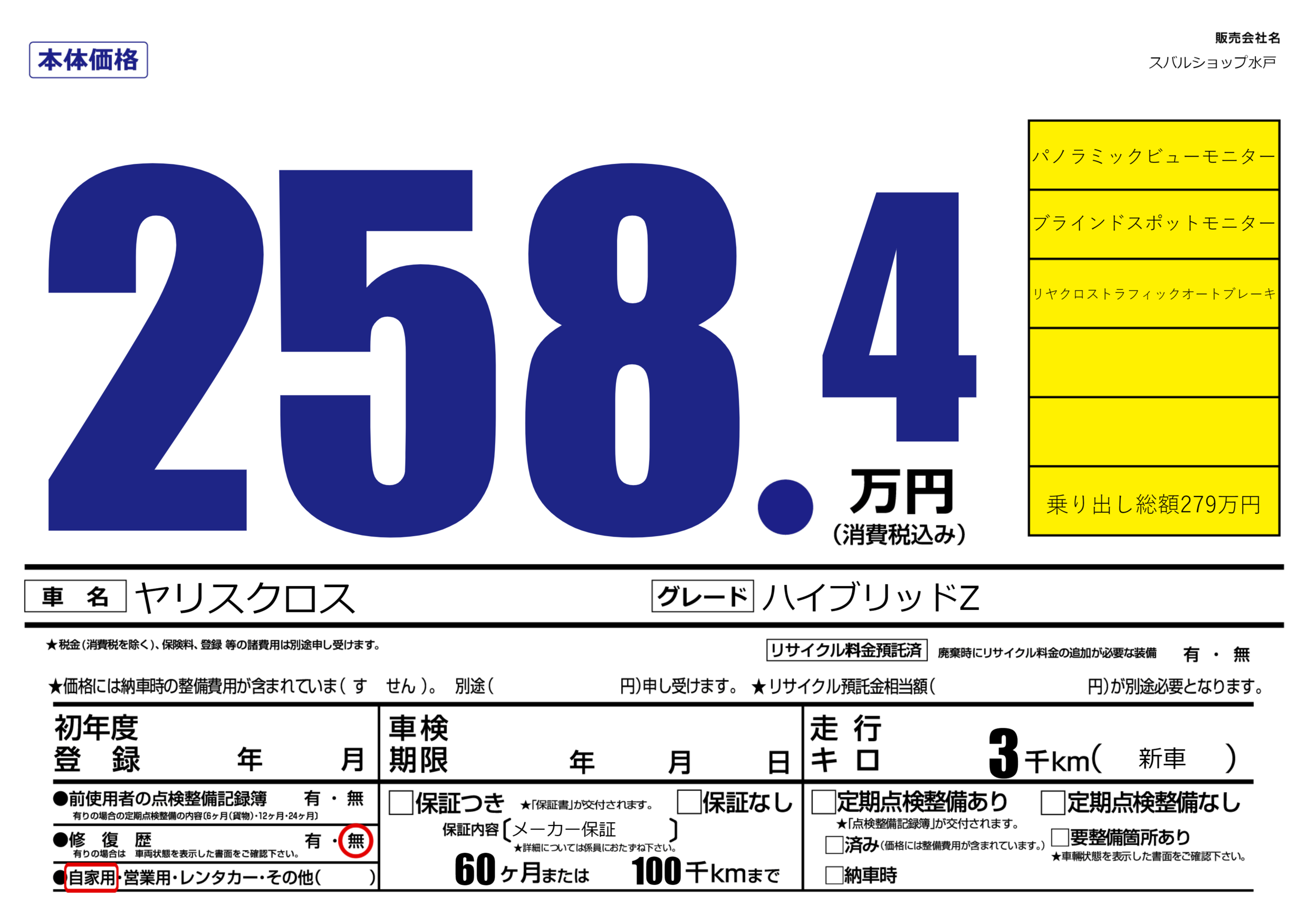 | 車名 | ヤリスクロス | グレード ミッション 排気量 |