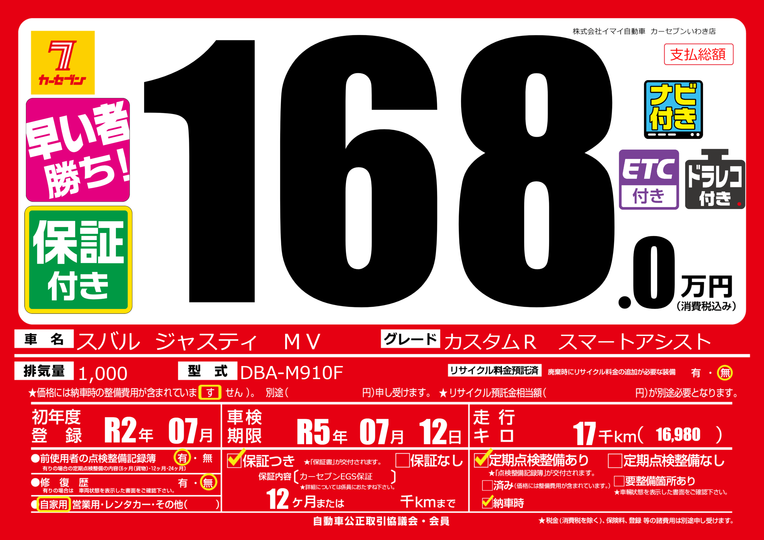 | 走行キロ | 1.7万km | 初年度登録 | R2年07月 |