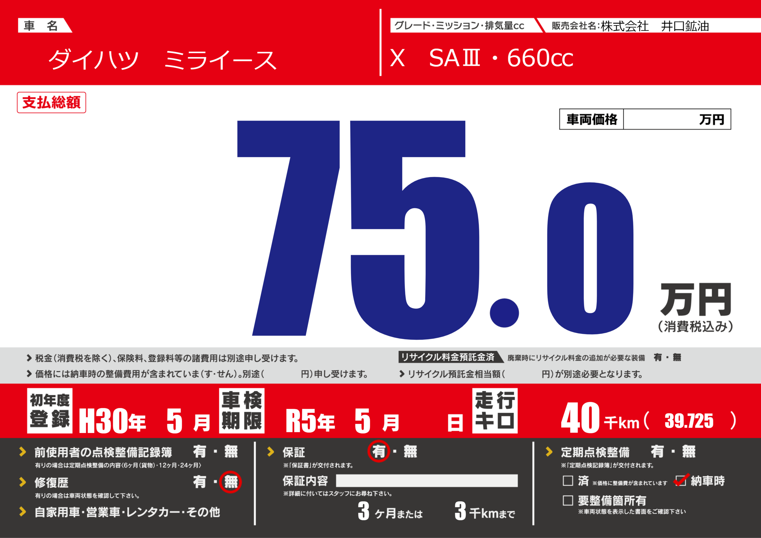 保証付き 保証内容(---) 3ヶ月または(3)千kmまで |