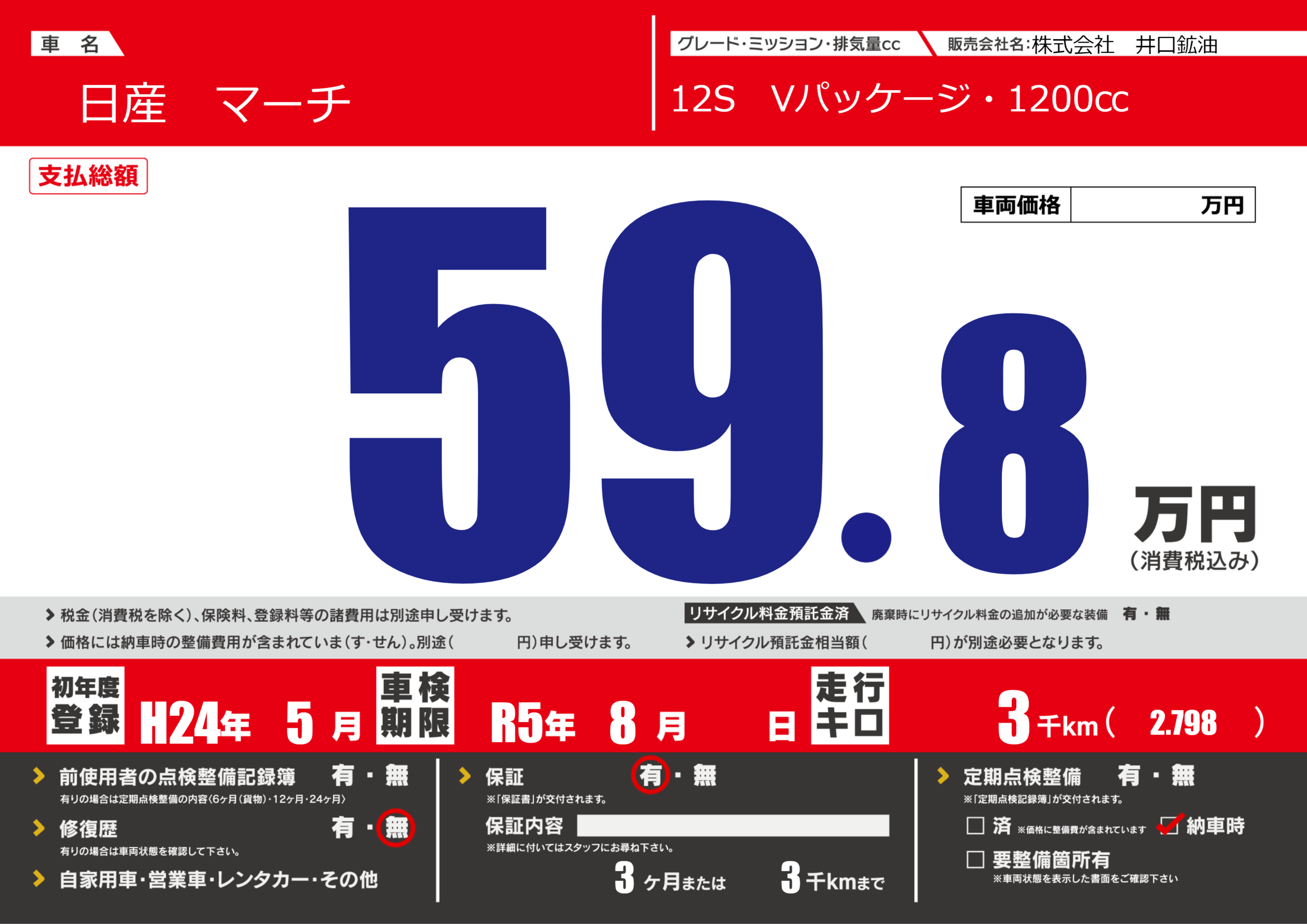 なし | 車検制限 | R5年8月---月 |