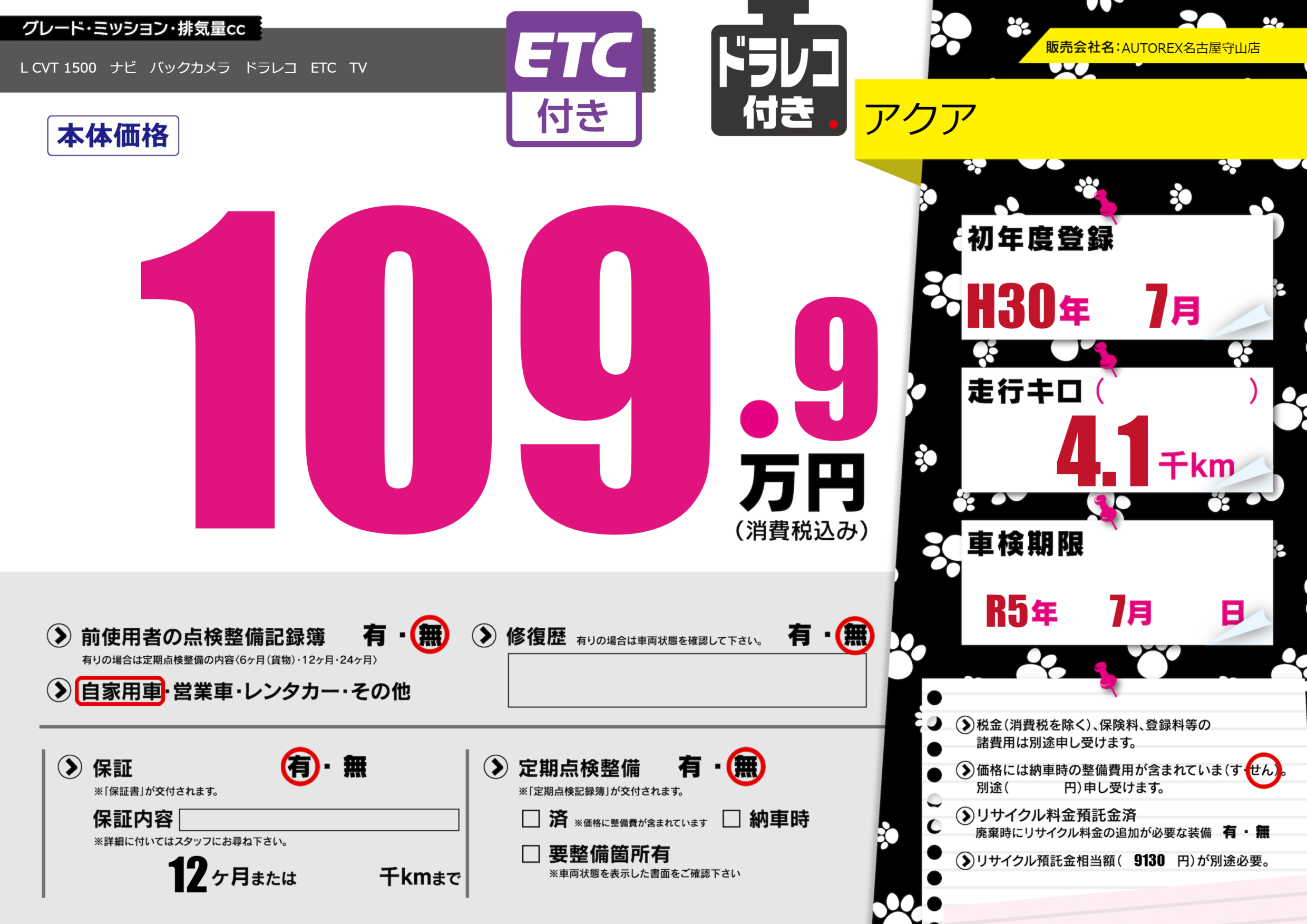 | 走行キロ | 0.4万km | 初年度登録 | H30年7月 |