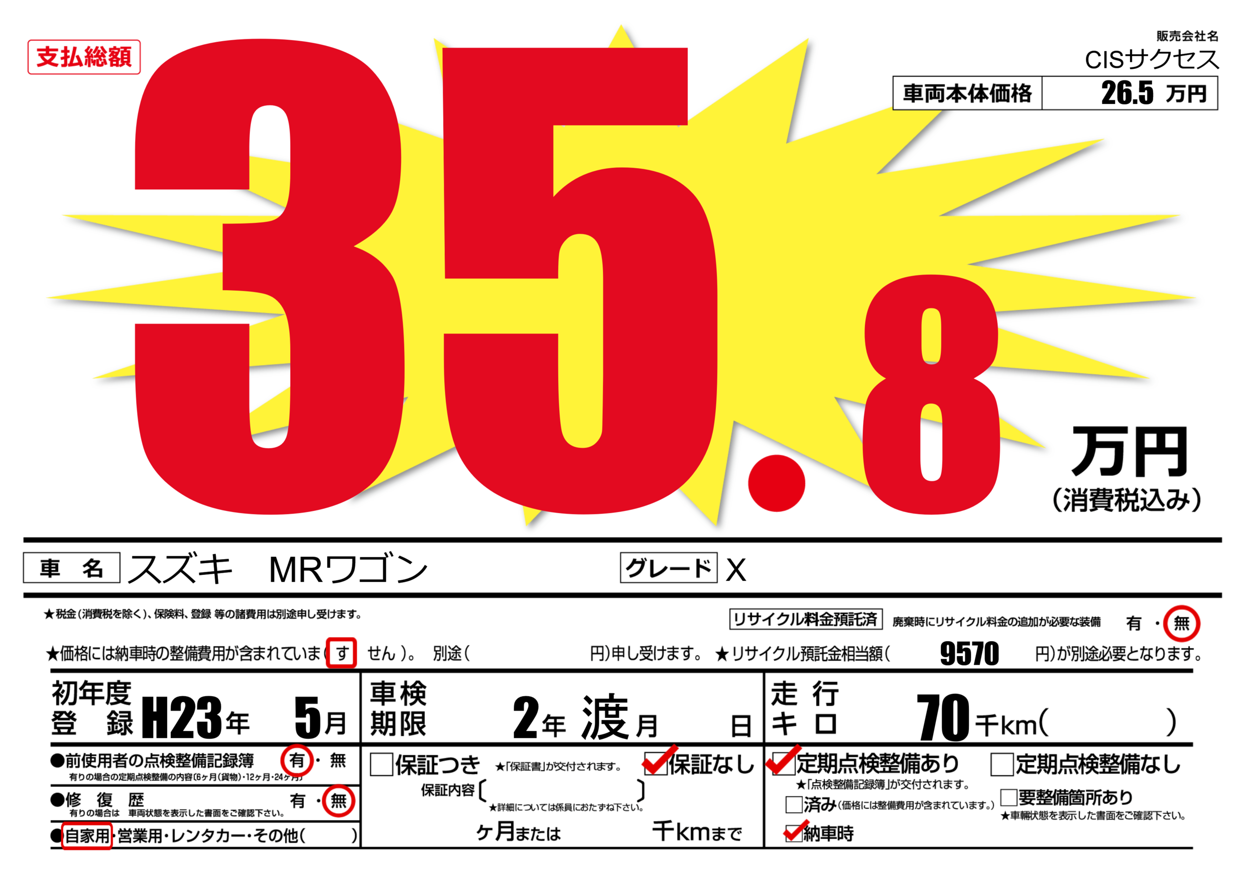 | 走行キロ | 7万km | 初年度登録 | H23年5月 |