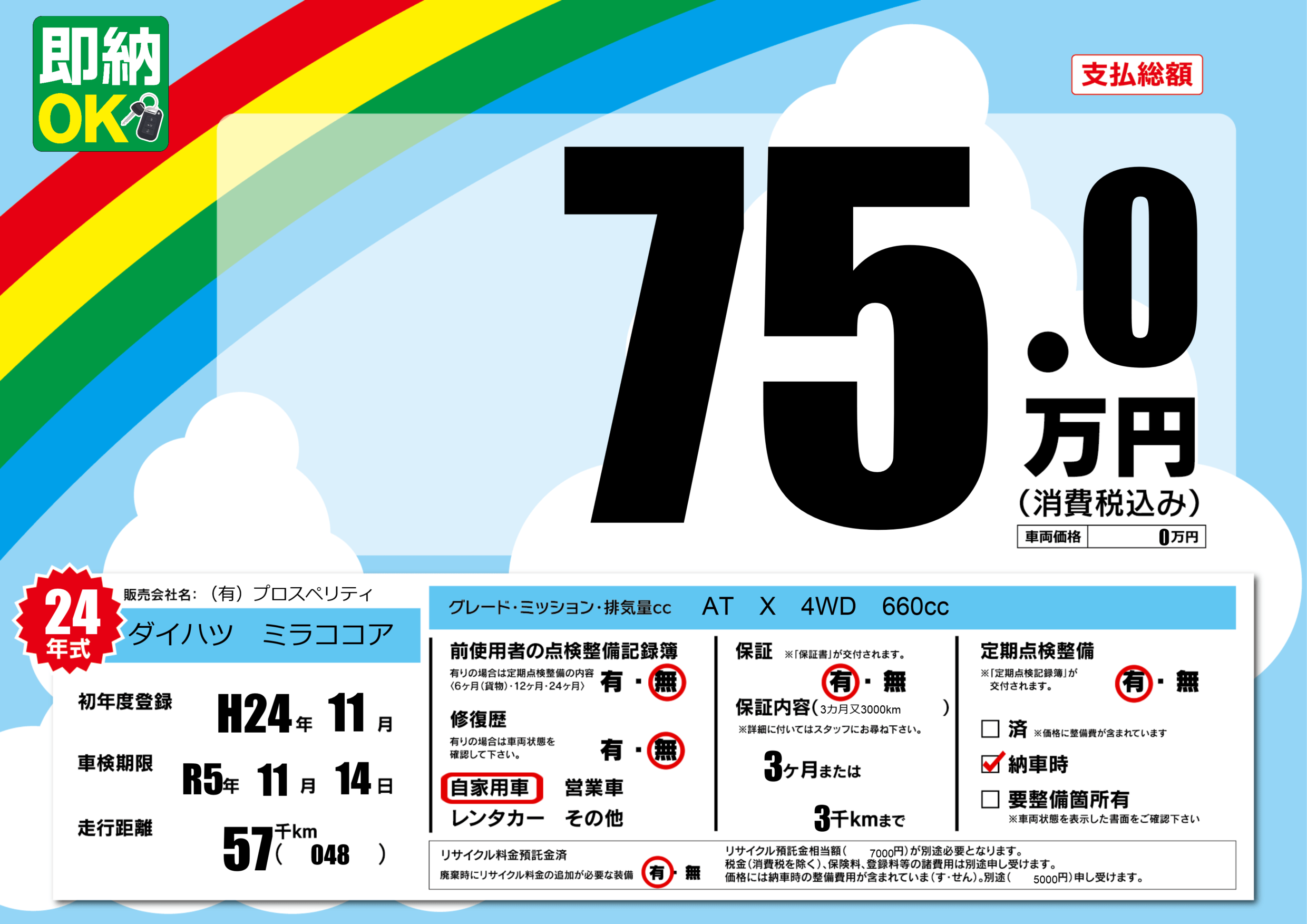 | 車名 | ダイハツ ミラココア | グレード ミッション 排気量 |