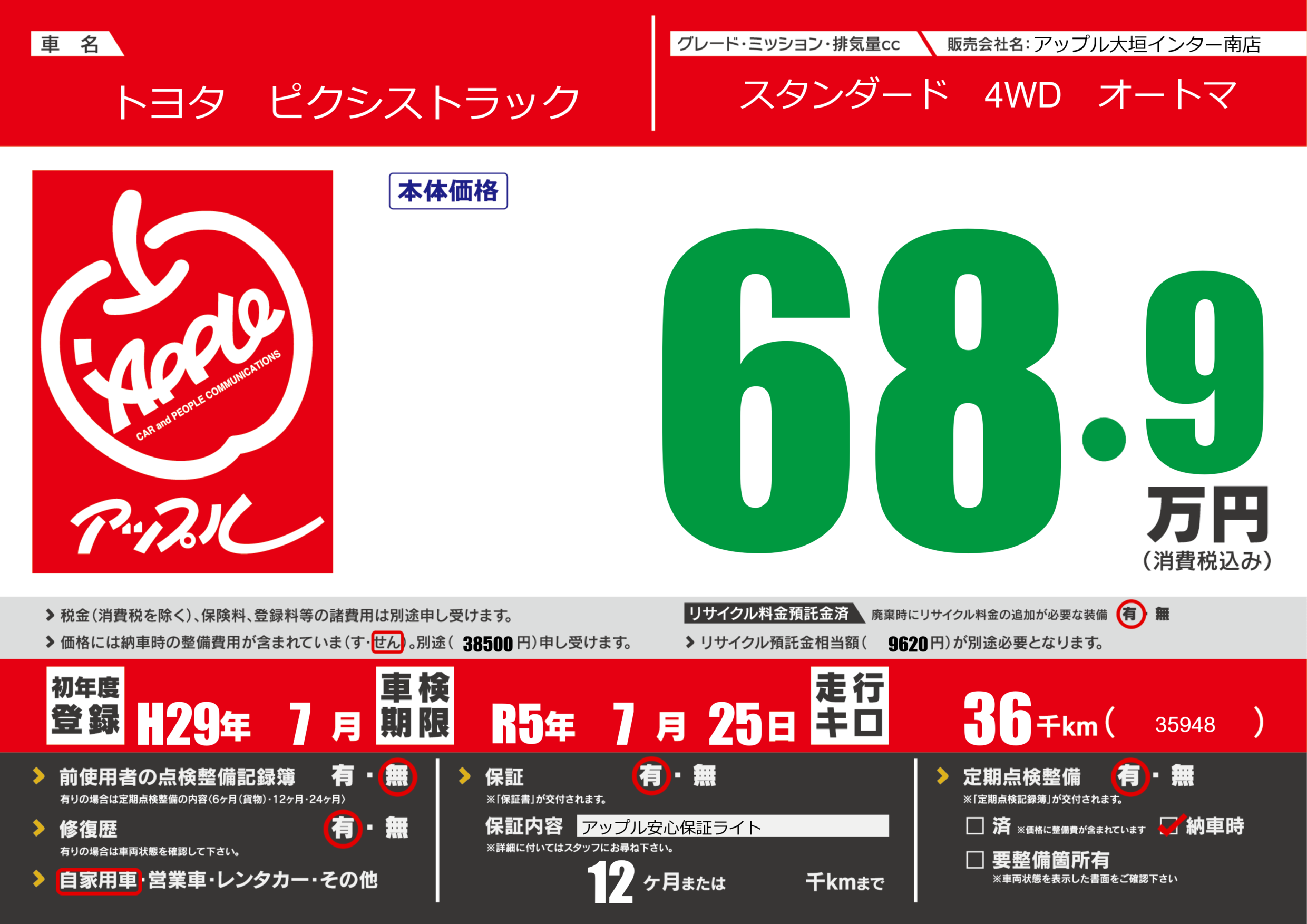 | 走行キロ | 3.6万km | 初年度登録 | H29年7月 |