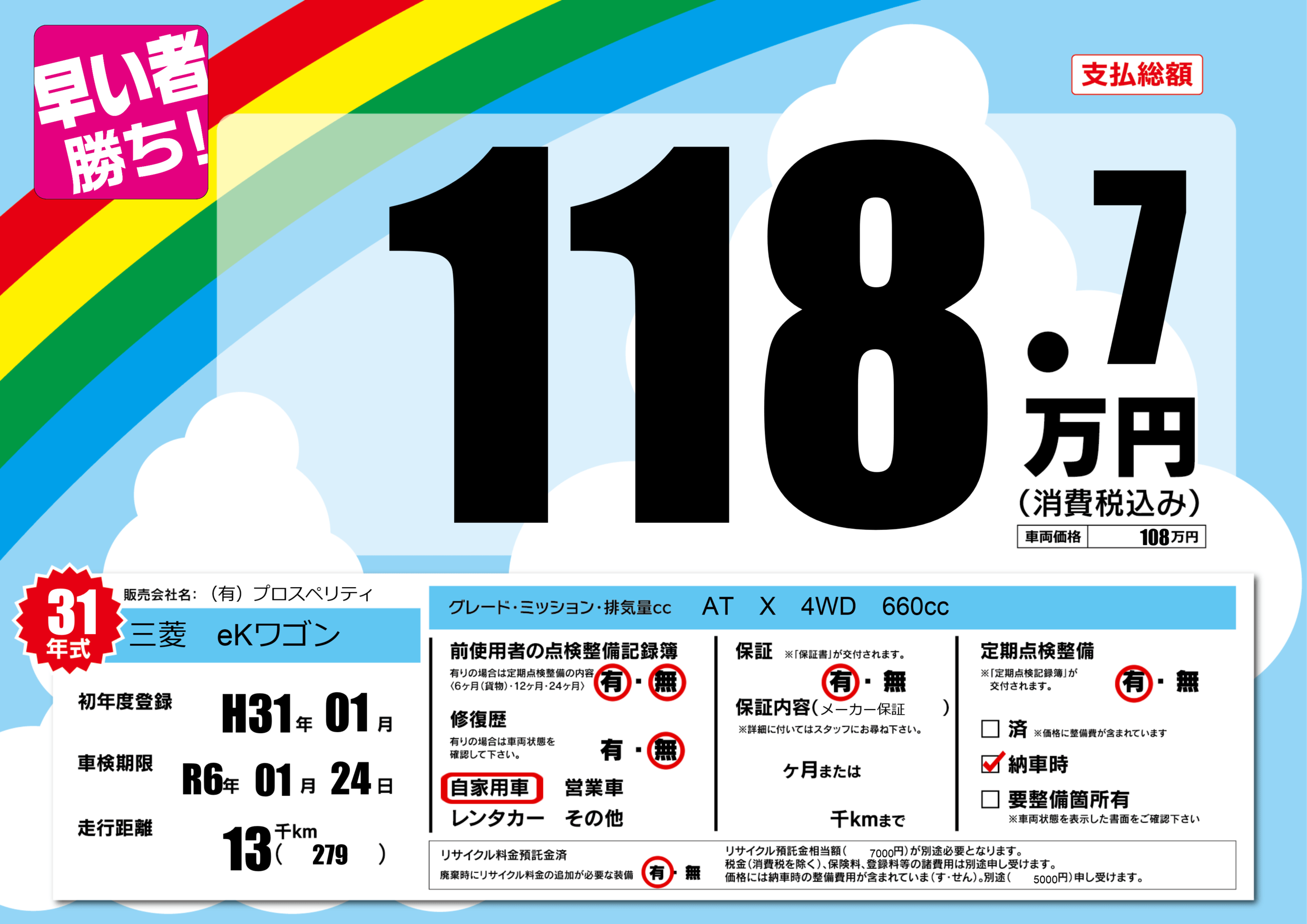 | 走行キロ | 1.3万km | 初年度登録 | H31年01月 |
