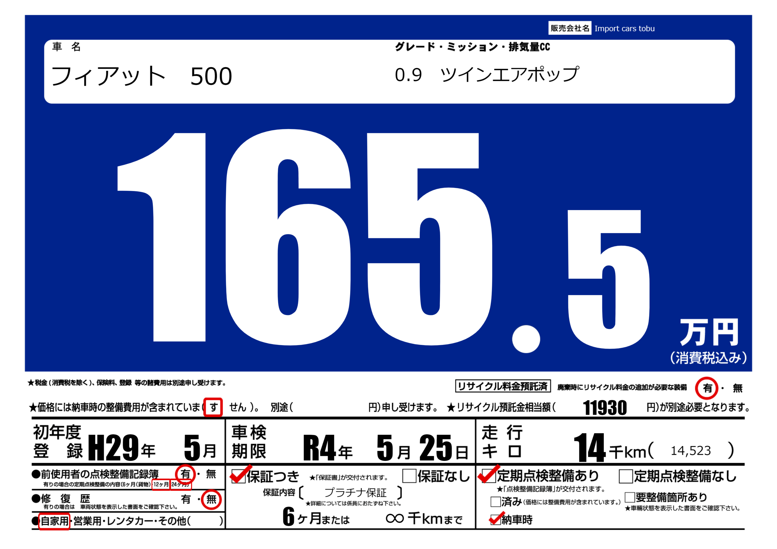 | 車名 | フィアット 500 | グレード ミッション 排気量 |