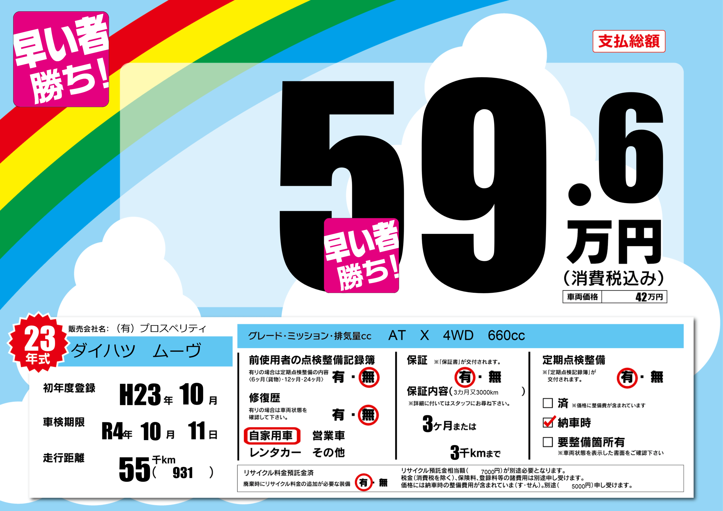 | 走行キロ | 5.5万km | 初年度登録 | H23年10月 |