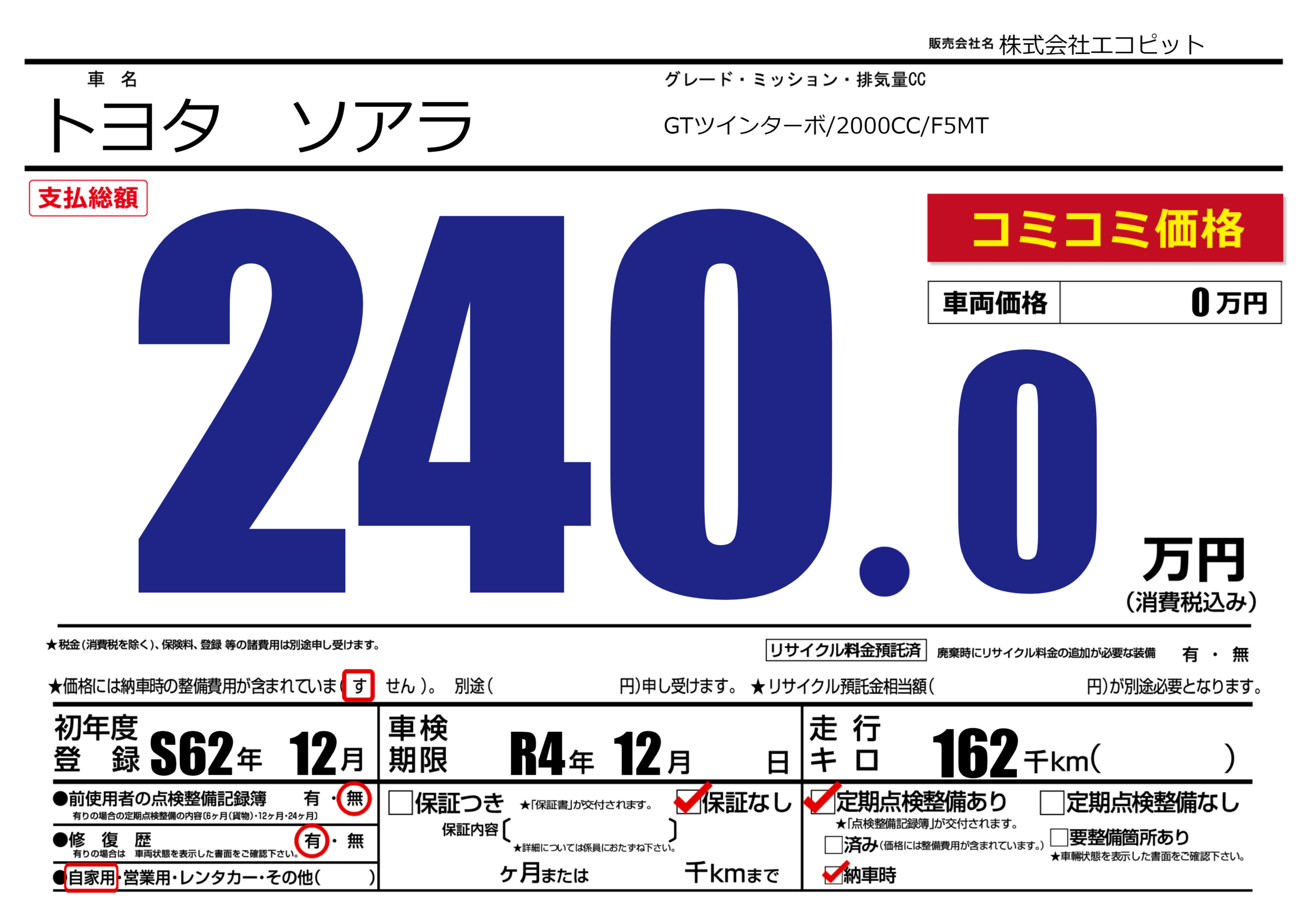 | 車検制限 | R4年 12月 - 日 | ||