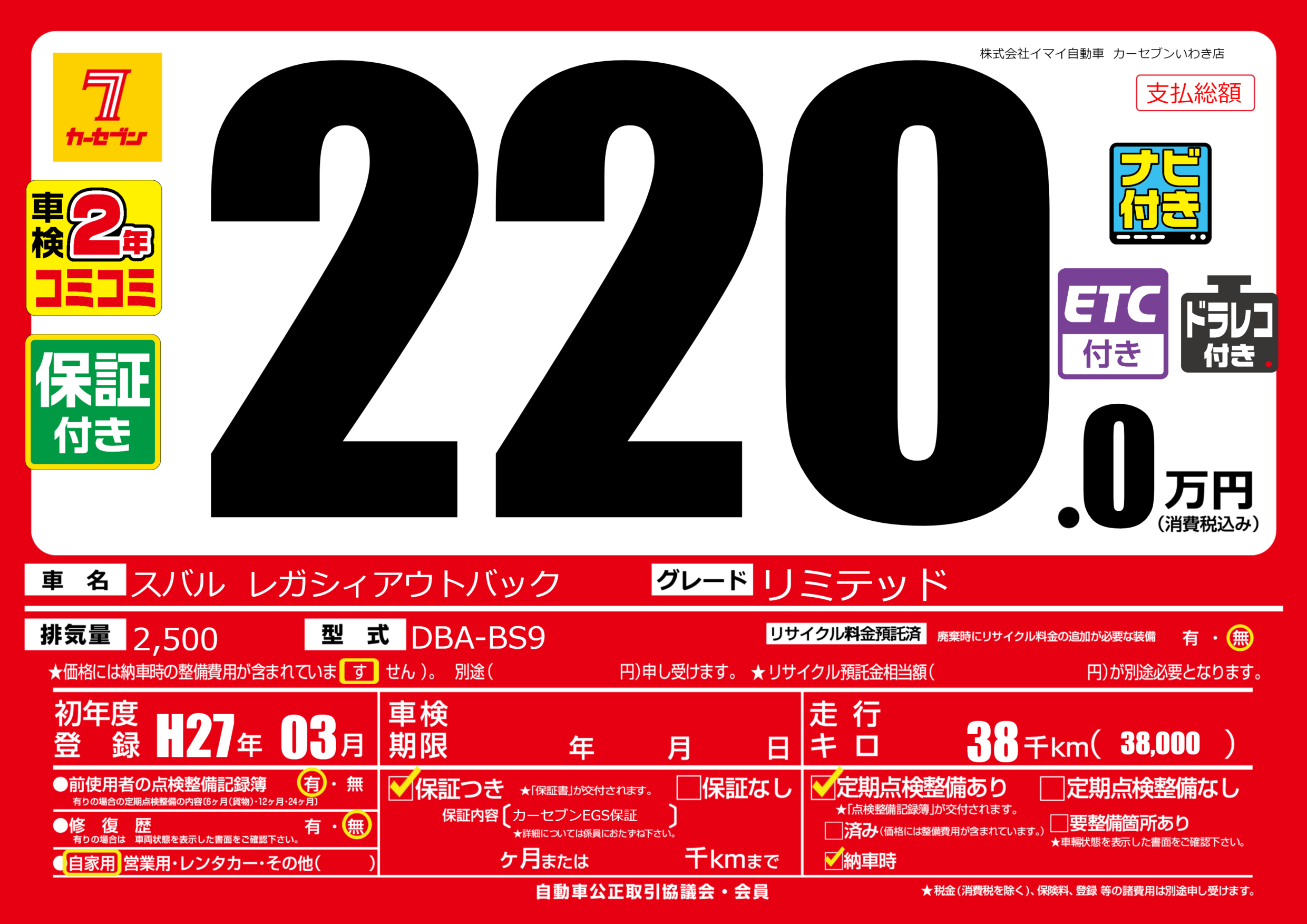 | 車名 | スバル レガシィアウトバック | グレード ミッション 排気量 |
