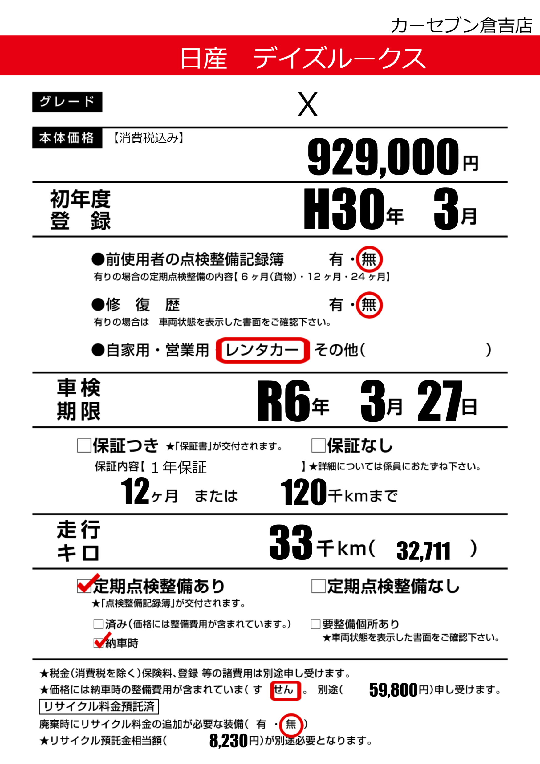 | 車名 | 日産 デイズルークス | グレード ミッション 排気量 |