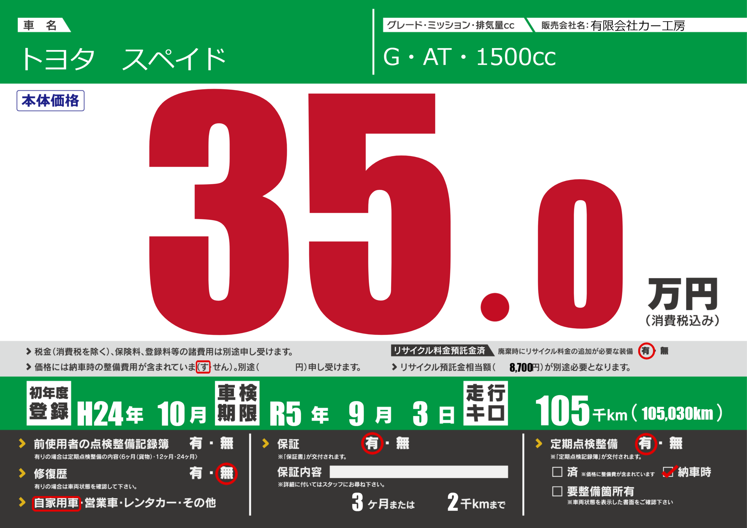 | 車名 | トヨタ スペイド | グレード ミッション 排気量 |