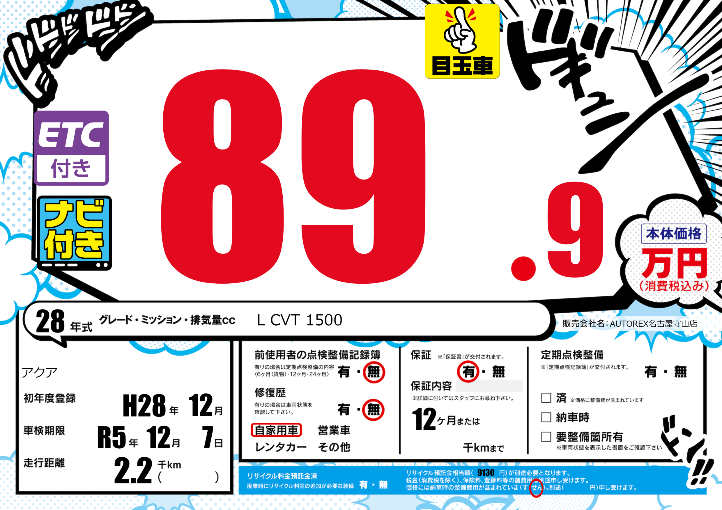 保証付き 保証内容(---) 12ヶ月または()千kmまで |