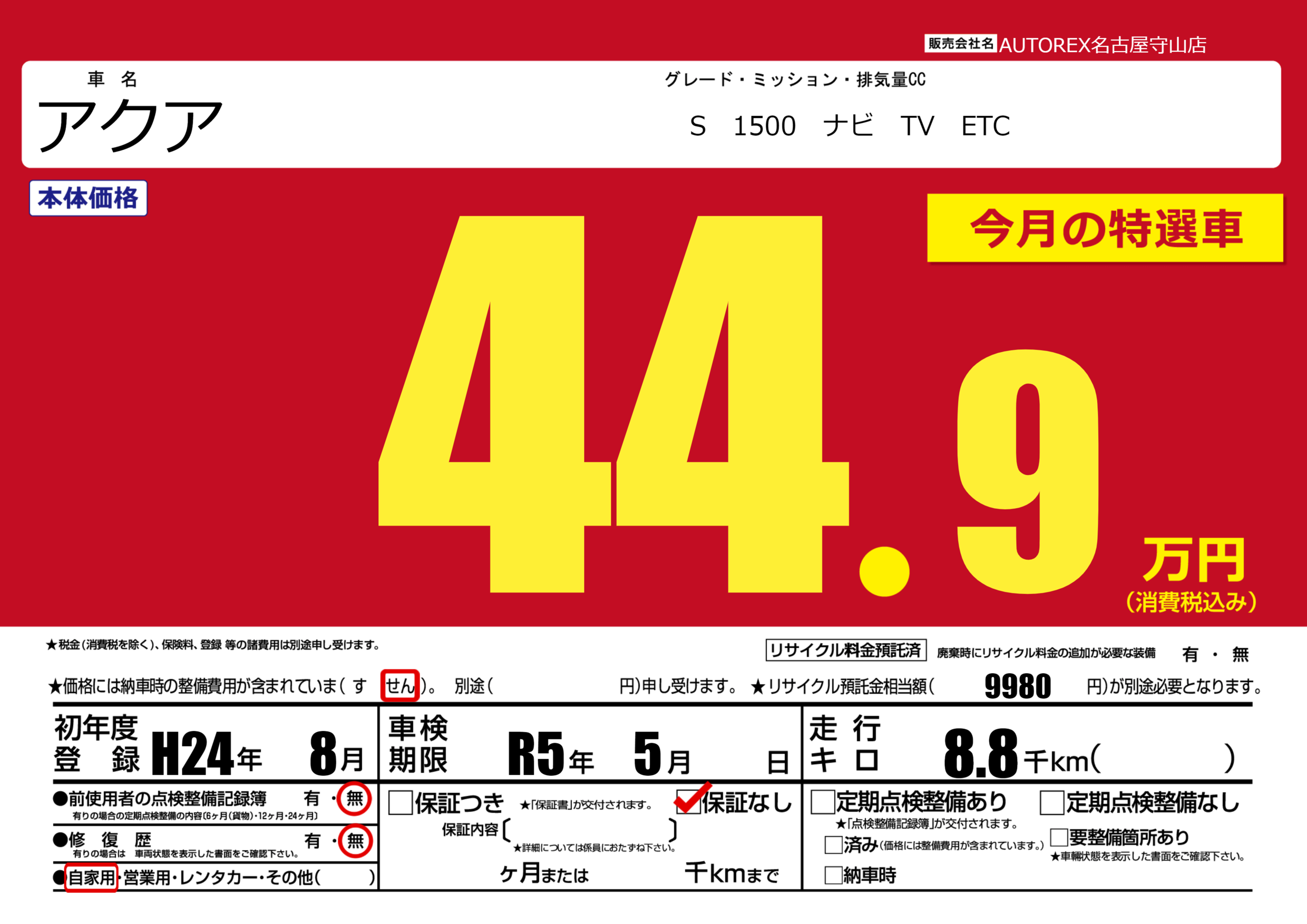 | 走行キロ | 0.8万km | 初年度登録 | H24年8月 |