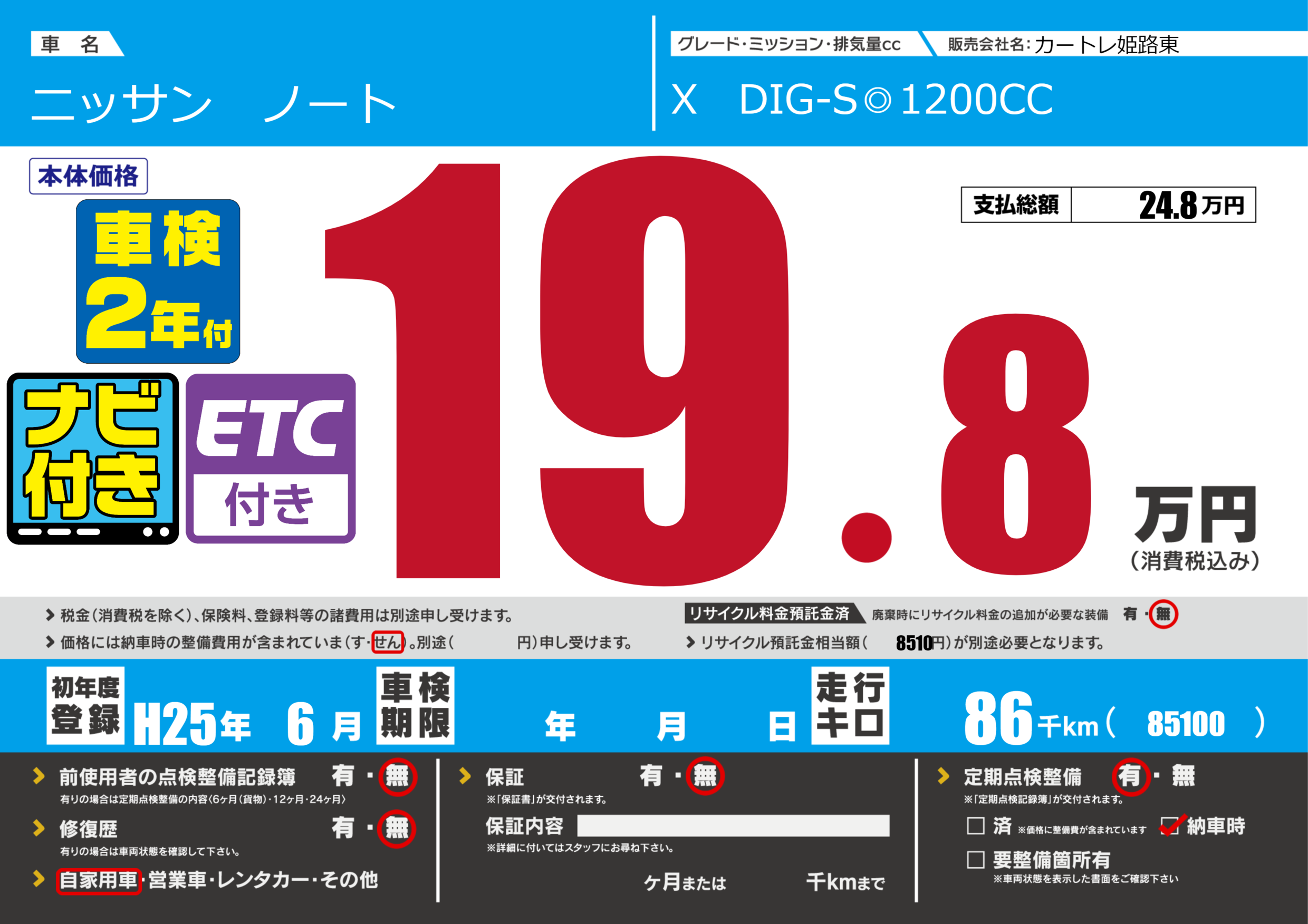 | 車名 | ニッサン ノート | グレード ミッション 排気量 |