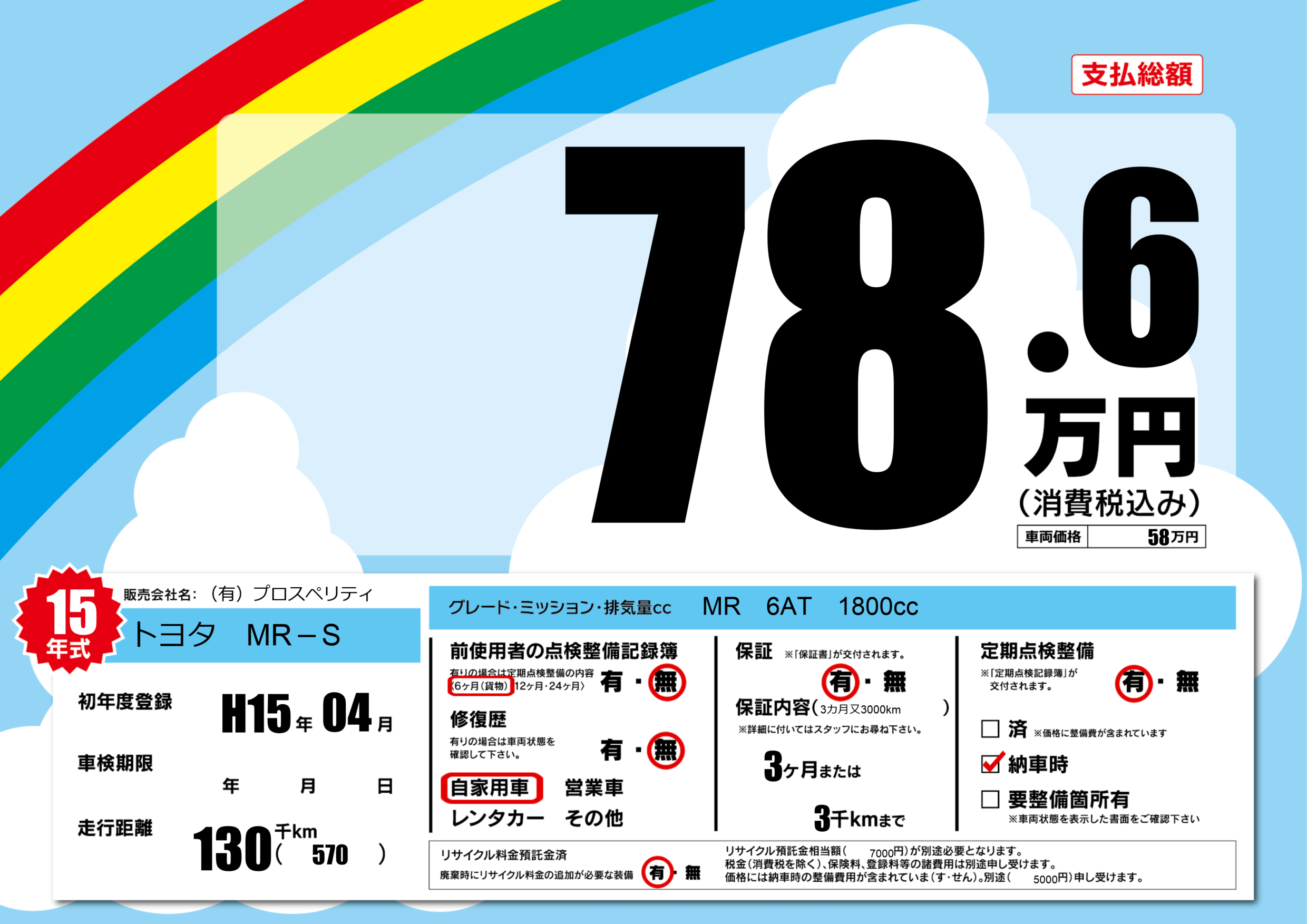 | 定期点検整備 | 定期点検整備あり 納車時あり | ||