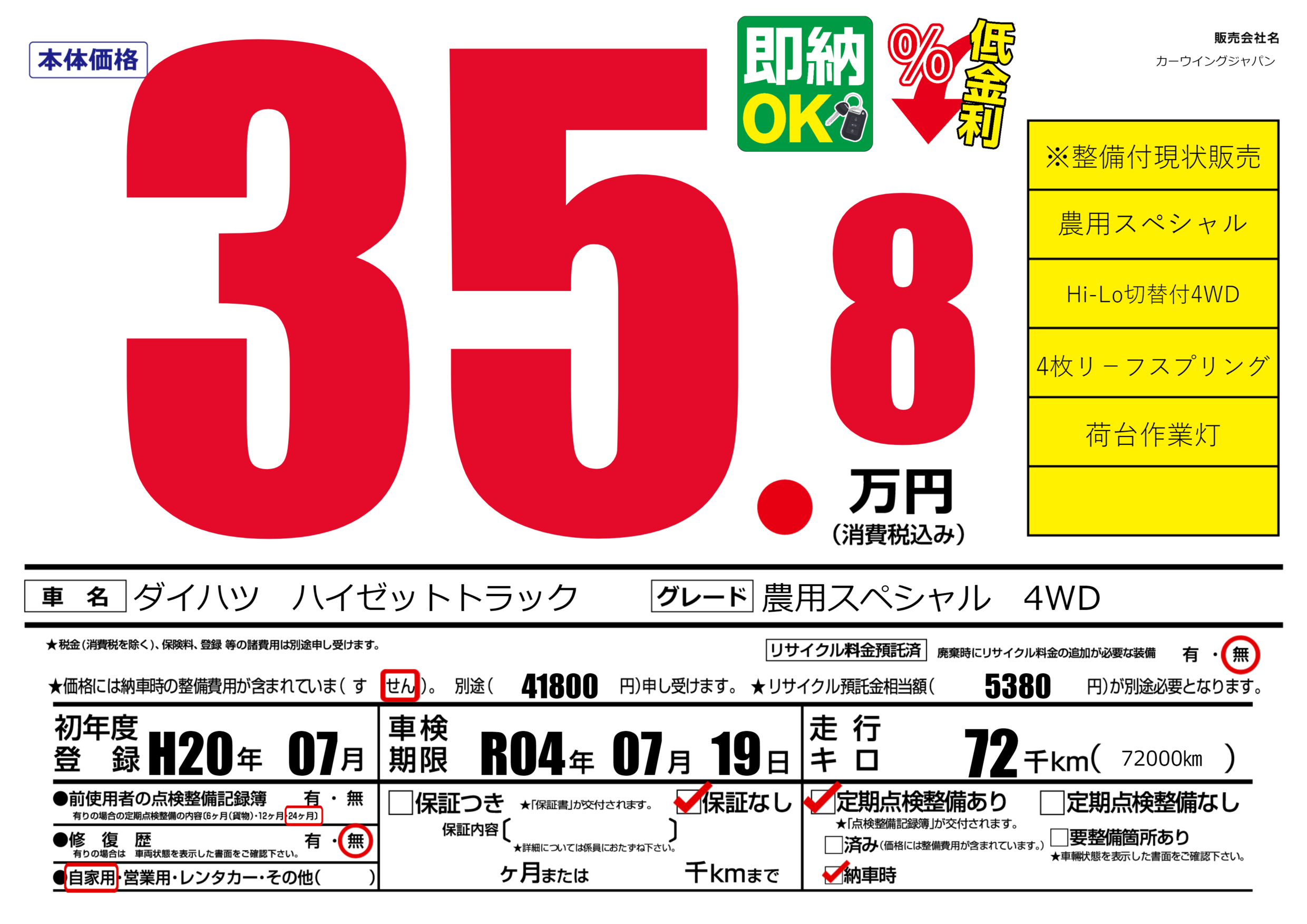 | 車名 | ダイハツ ハイゼットトラック | グレード ミッション 排気量 |