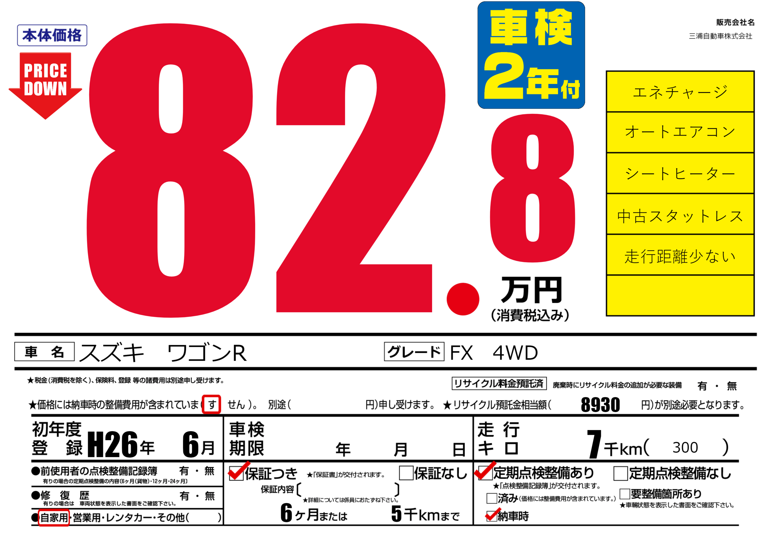 | 車名 | スズキ ワゴンR | グレード ミッション 排気量 |