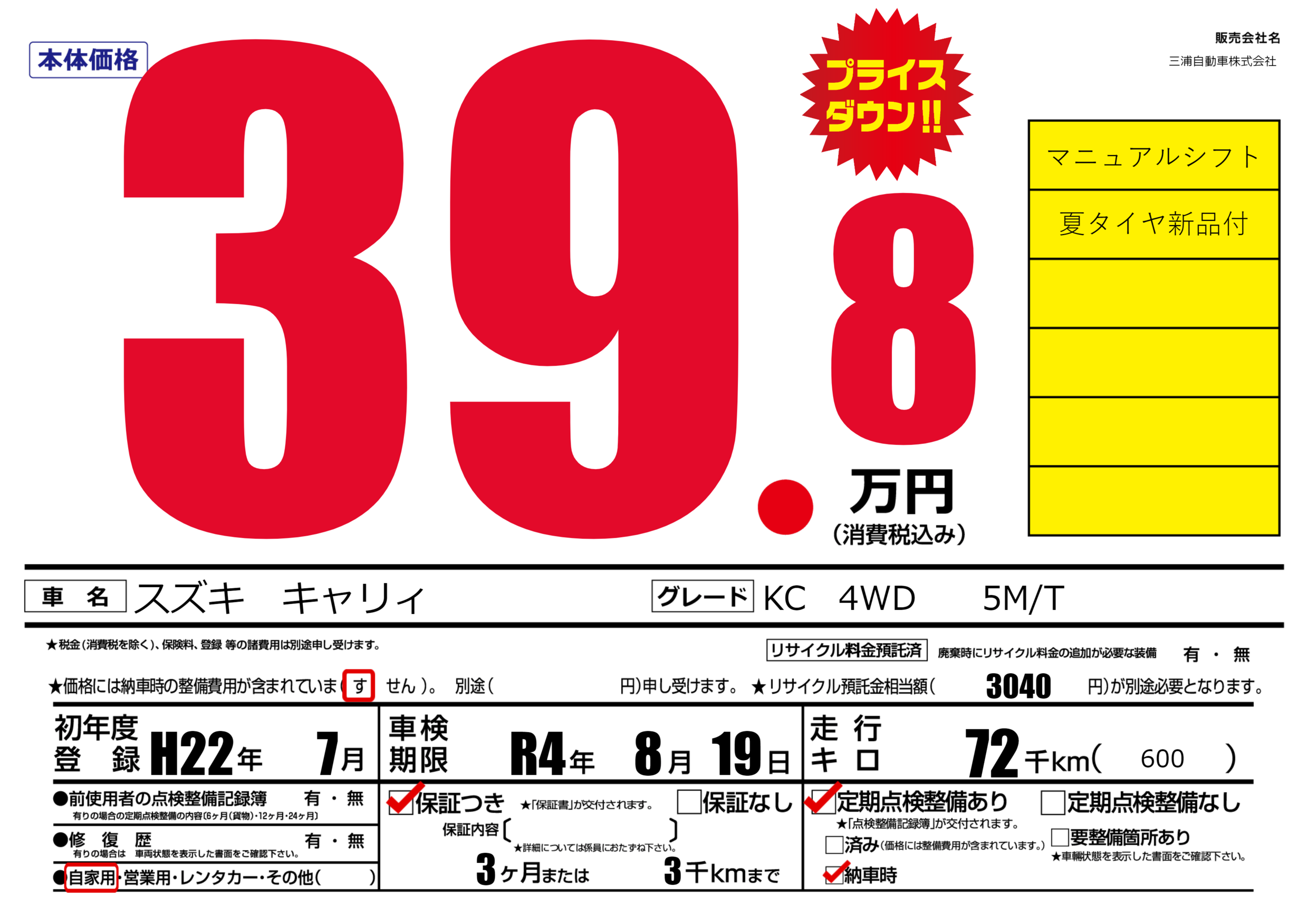 | 車名 | スズキ キャリィ | グレード ミッション 排気量 |