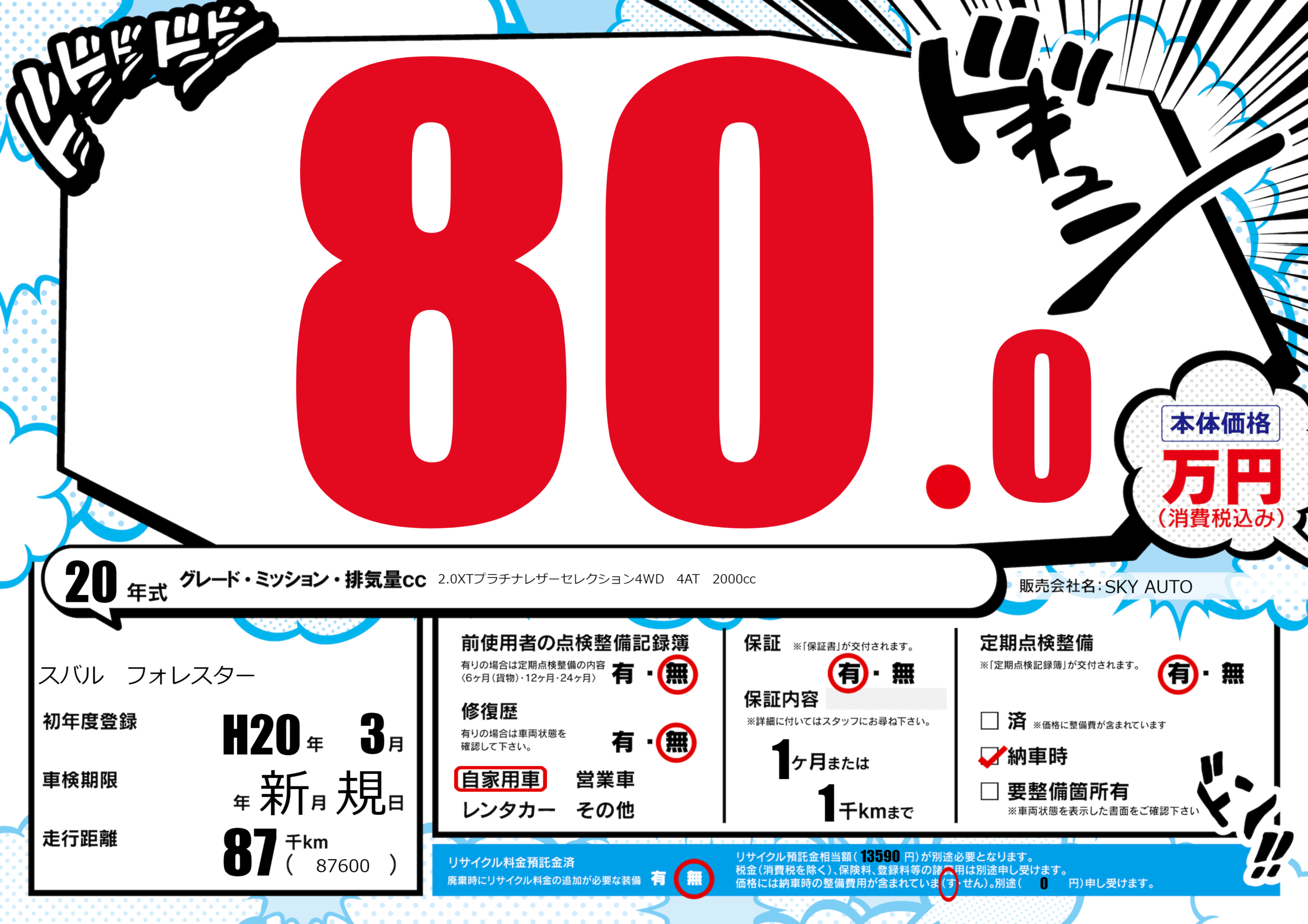 | 車名 | スバル フォレスター | グレード ミッション 排気量 |