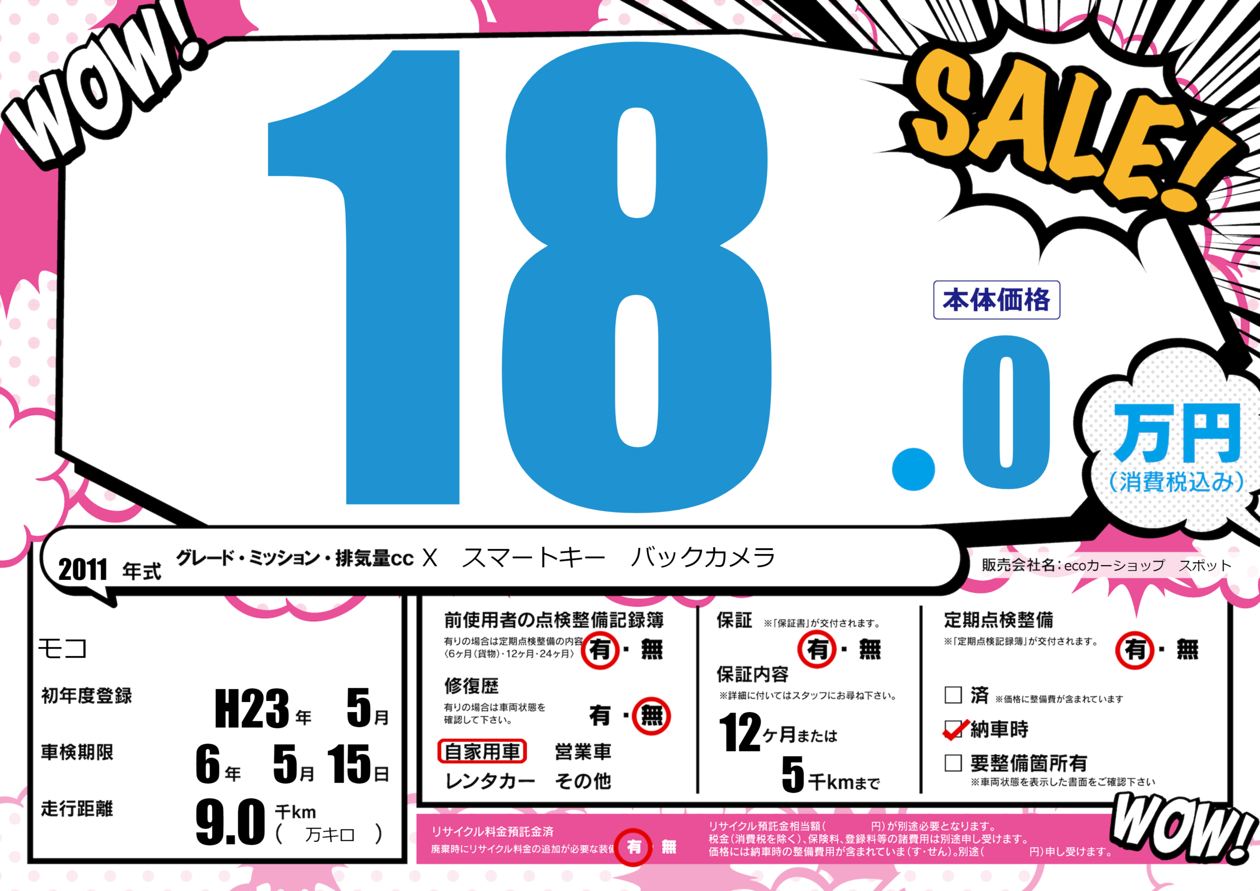 | 走行キロ | 0.9万km | 初年度登録 | H23年5月 |