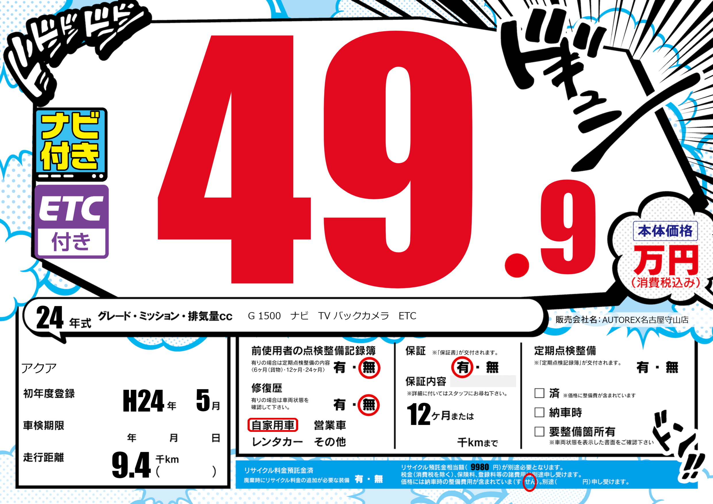 | 走行キロ | 0.9万km | 初年度登録 | H24年5月 |
