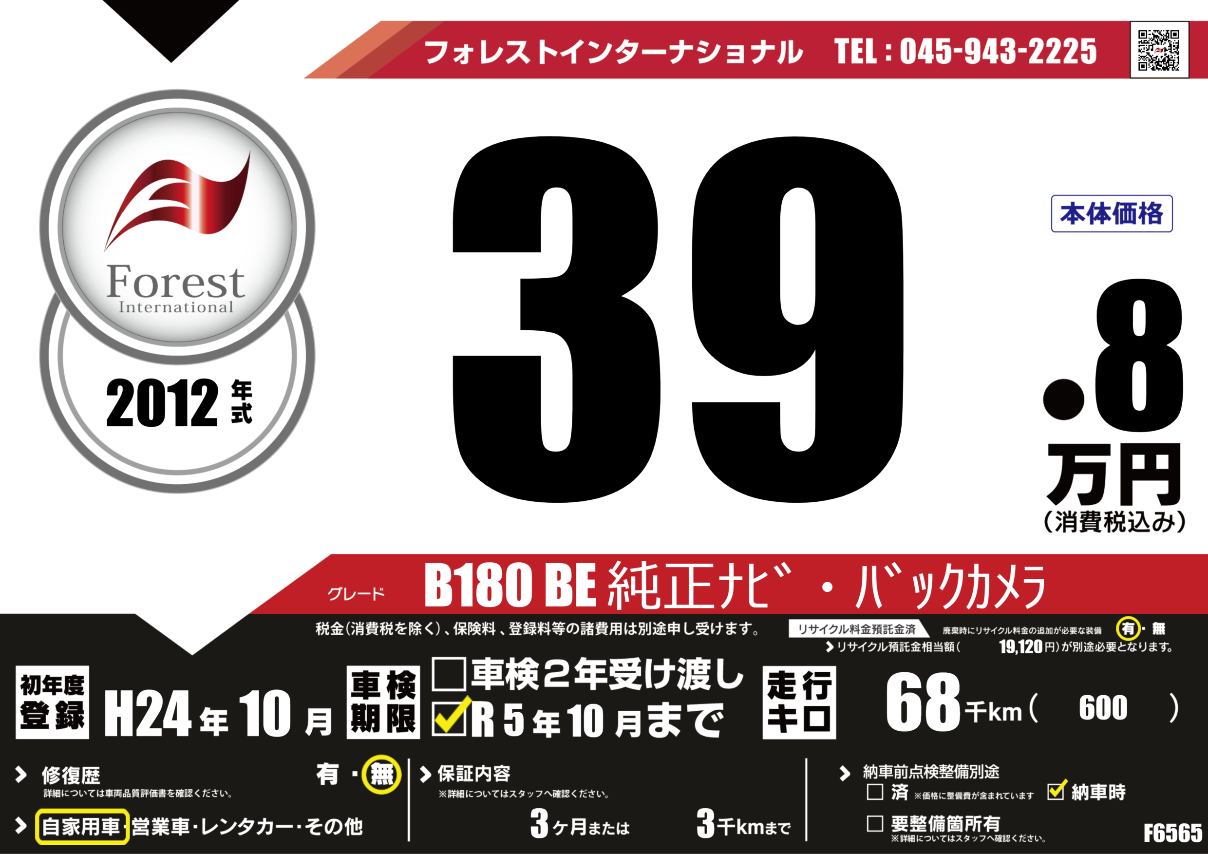 | 走行キロ | 6.8万km | 初年度登録 | H24年10月 |