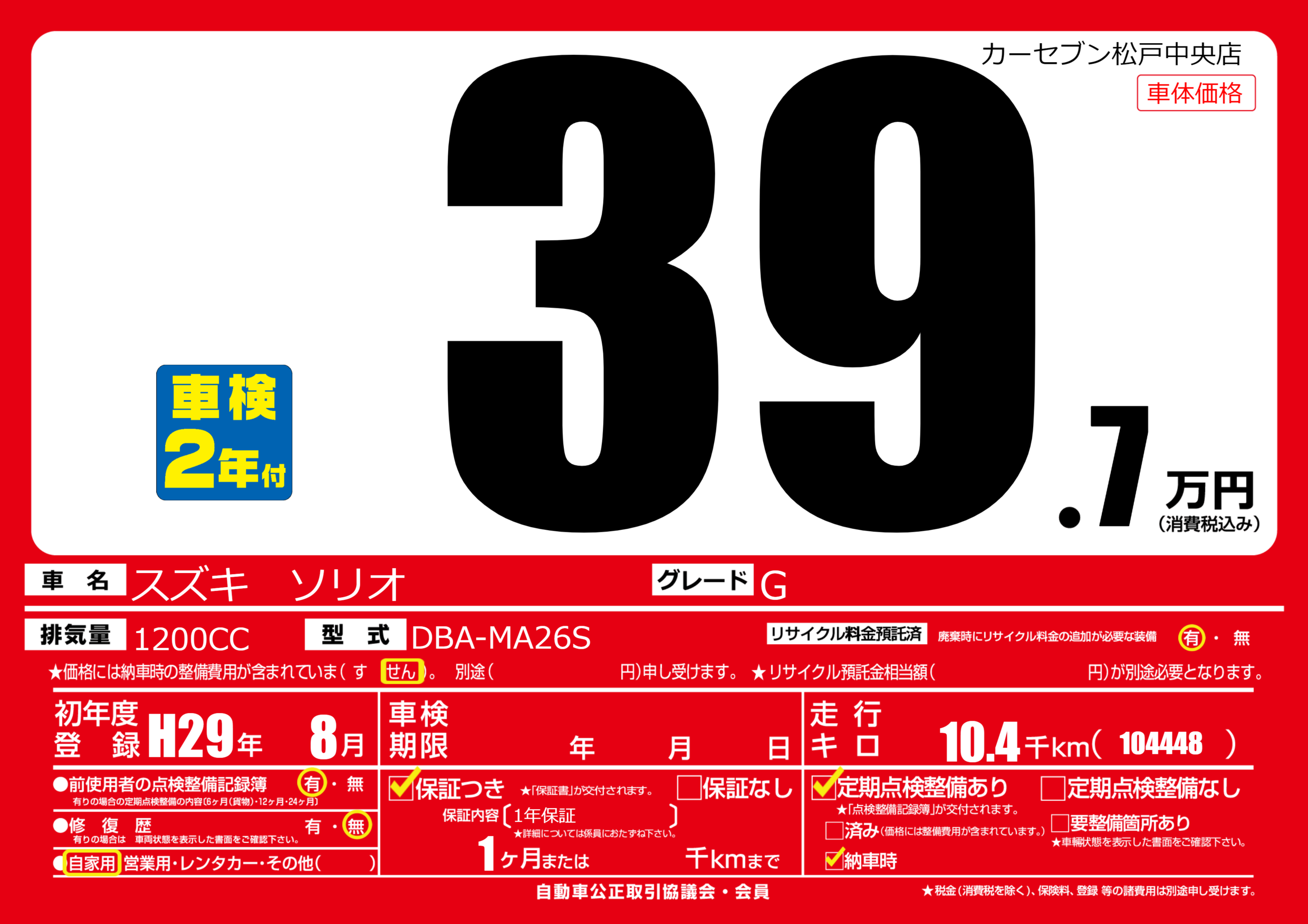 | 車名 | スズキ ソリオ | グレード ミッション 排気量 |