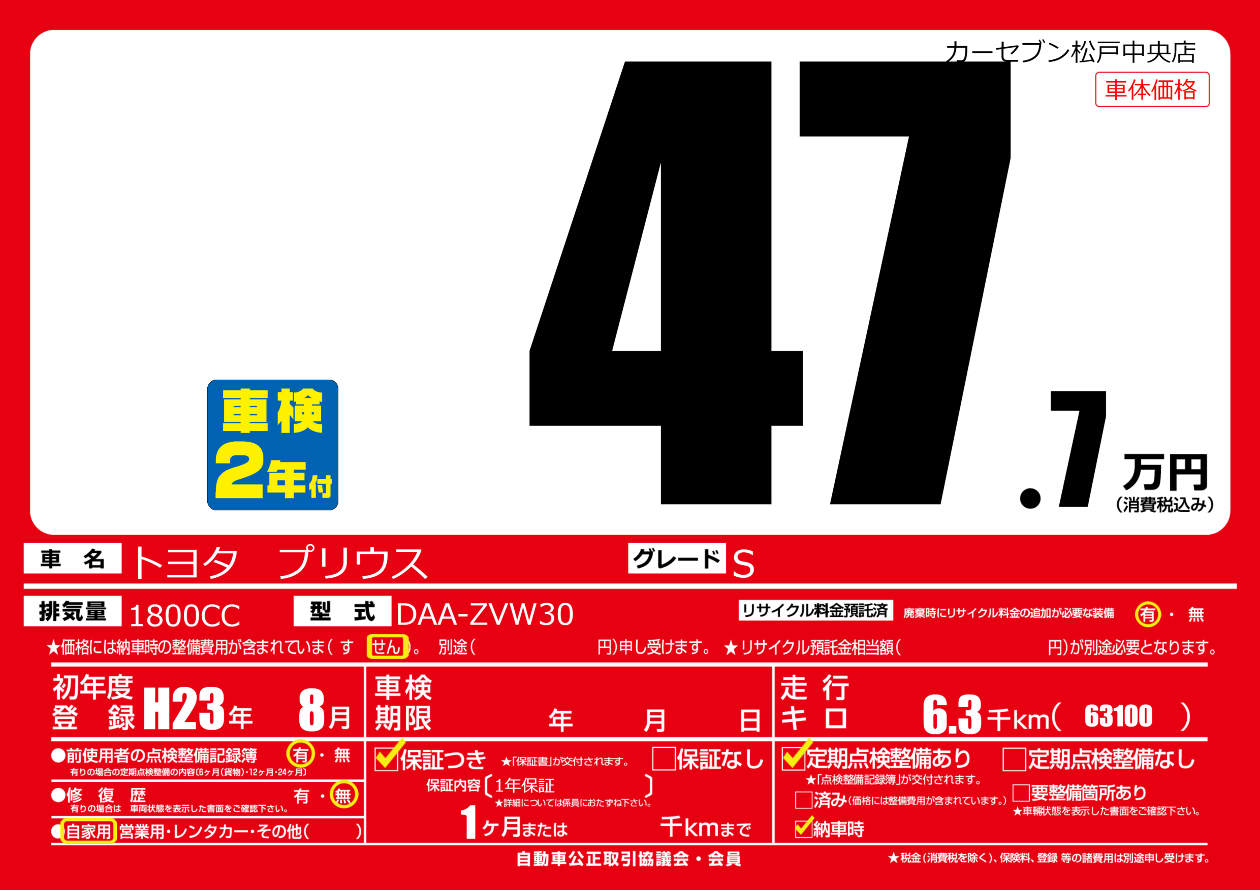 | 車名 | トヨタ プリウス | グレード ミッション 排気量 |