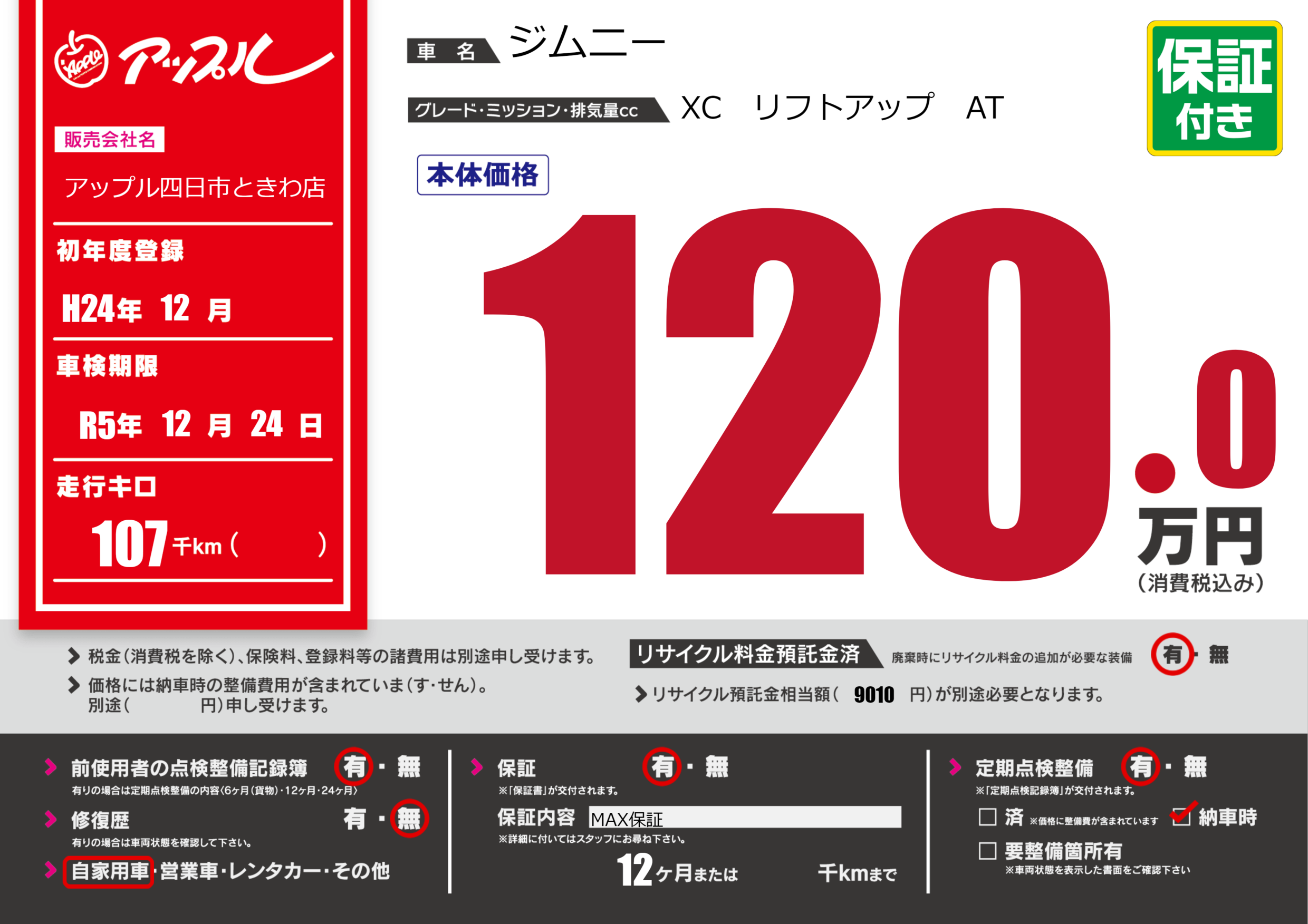 保証付き 保証内容(MAX保証) 12ヶ月または千km |