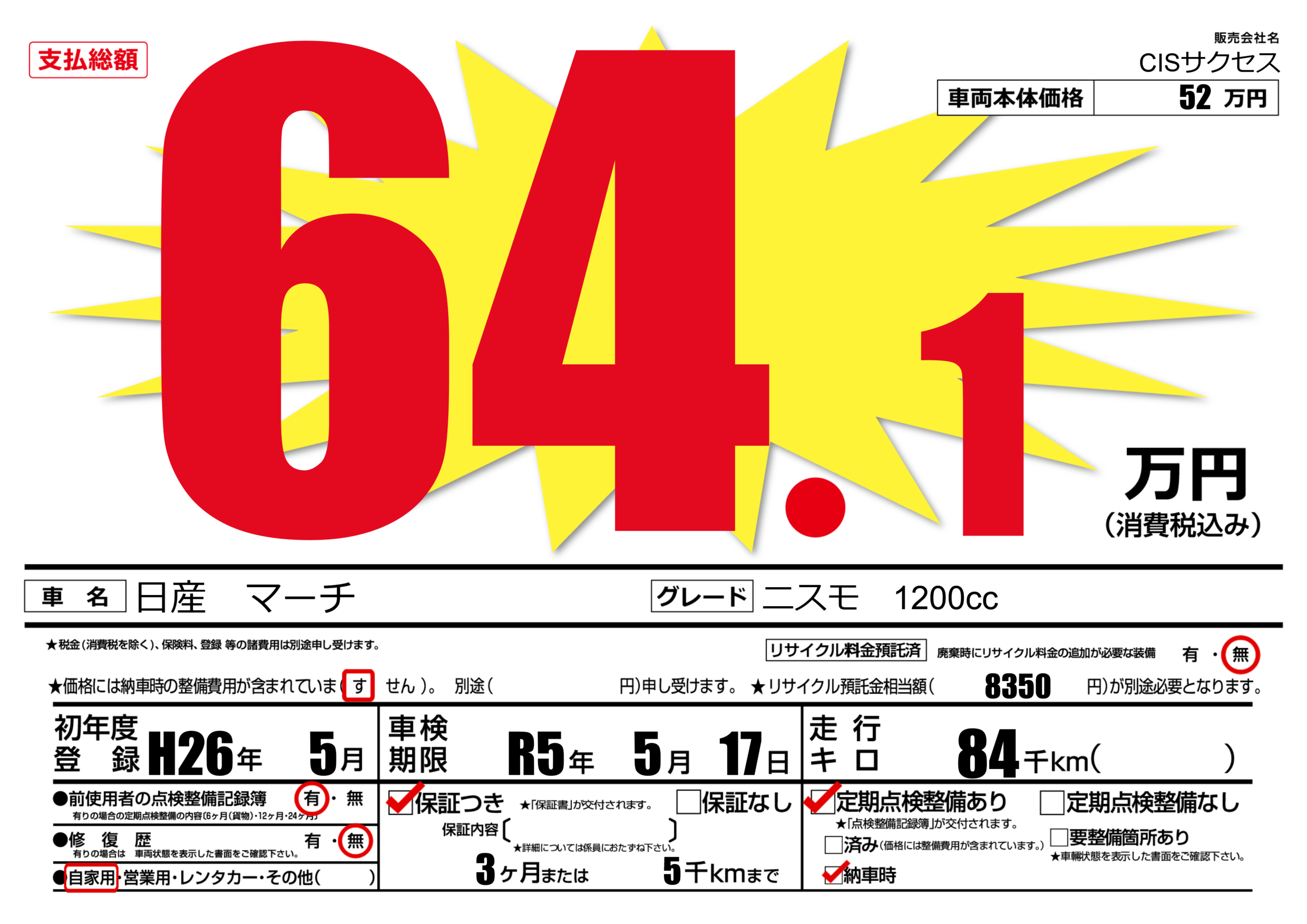 | 車名 | 日産 マーチ | グレード ミッション 排気量 |