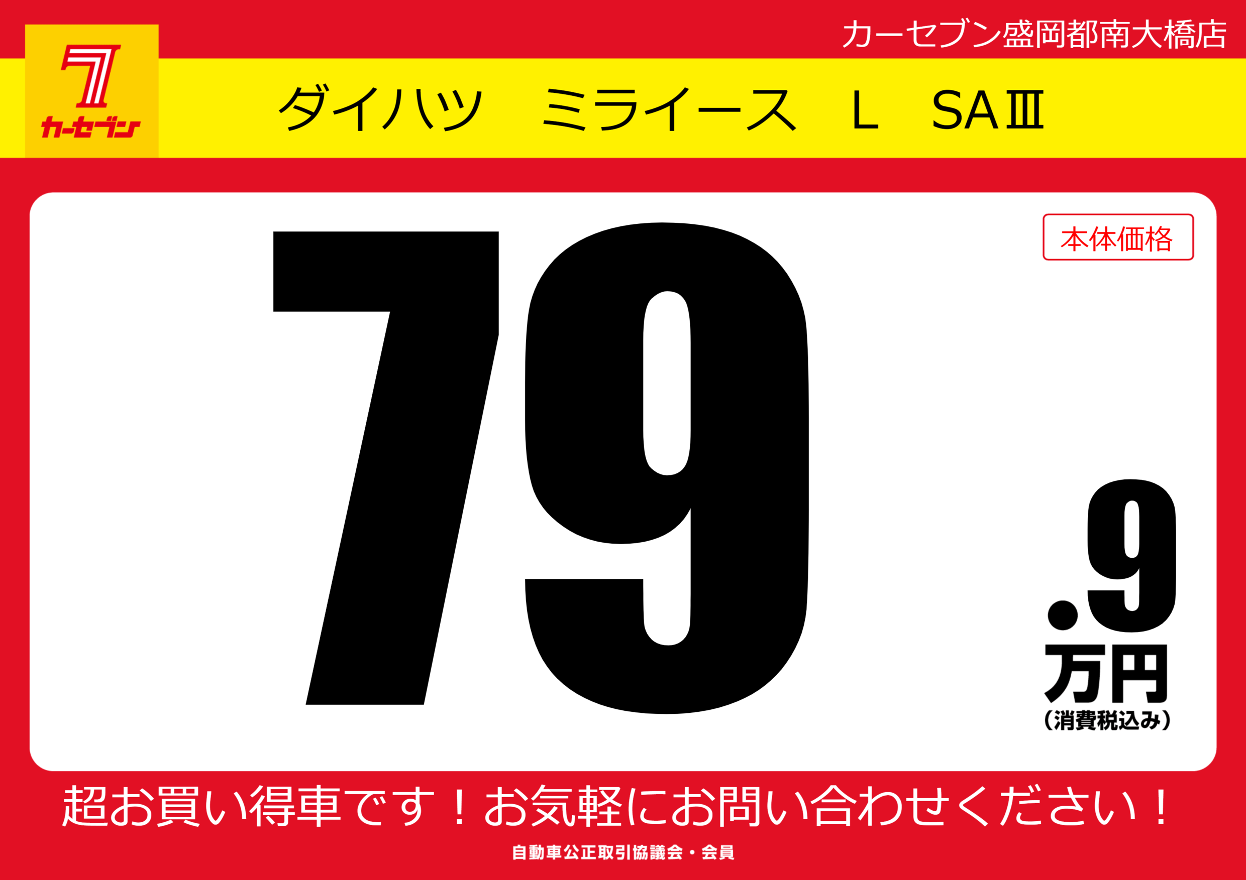 | 車名 | ダイハツ ミライース L SAⅢ | グレード ミッション 排気量 |
