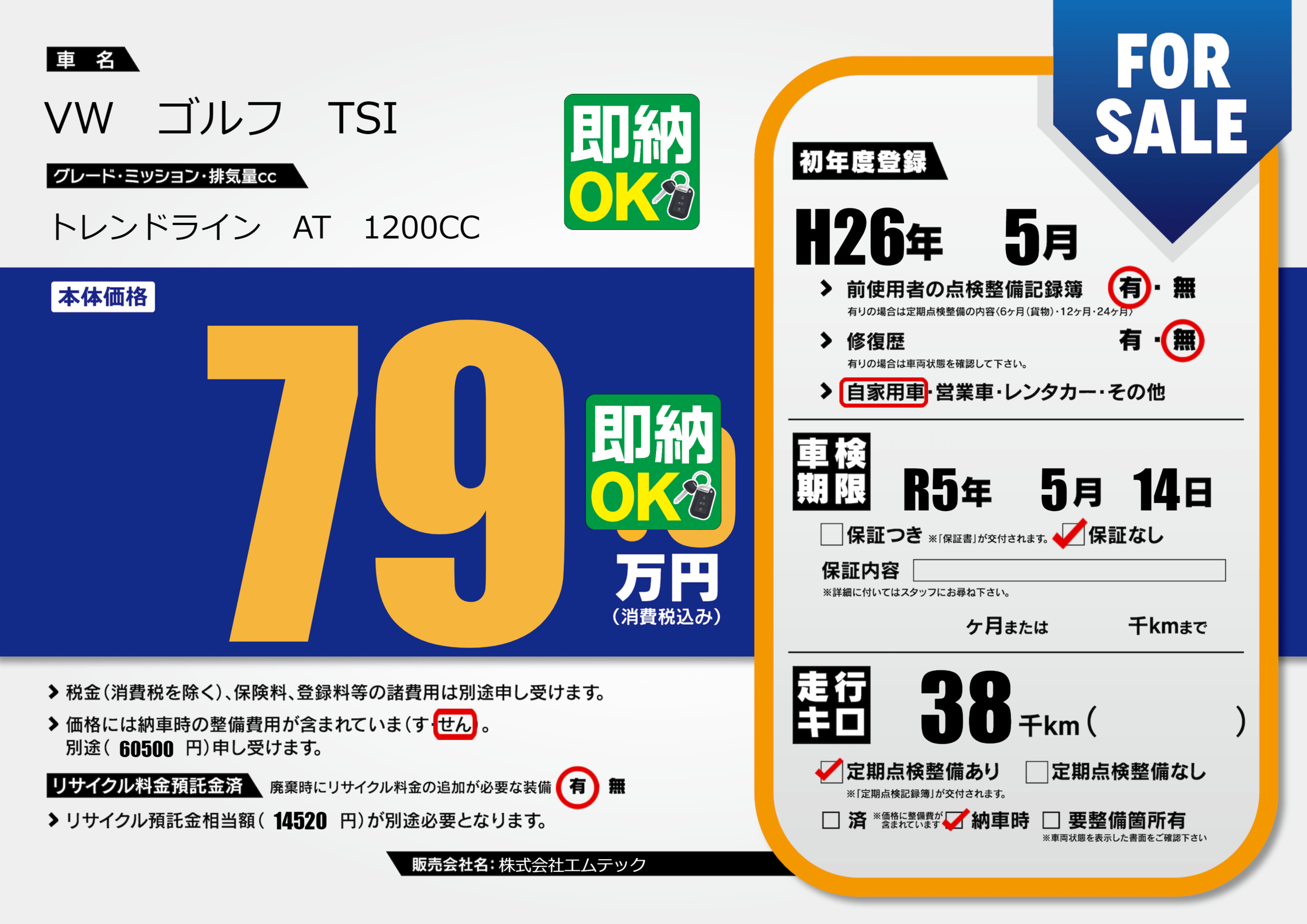 | 車名 | VW ゴルフ TSI | グレード ミッション 排気量 |