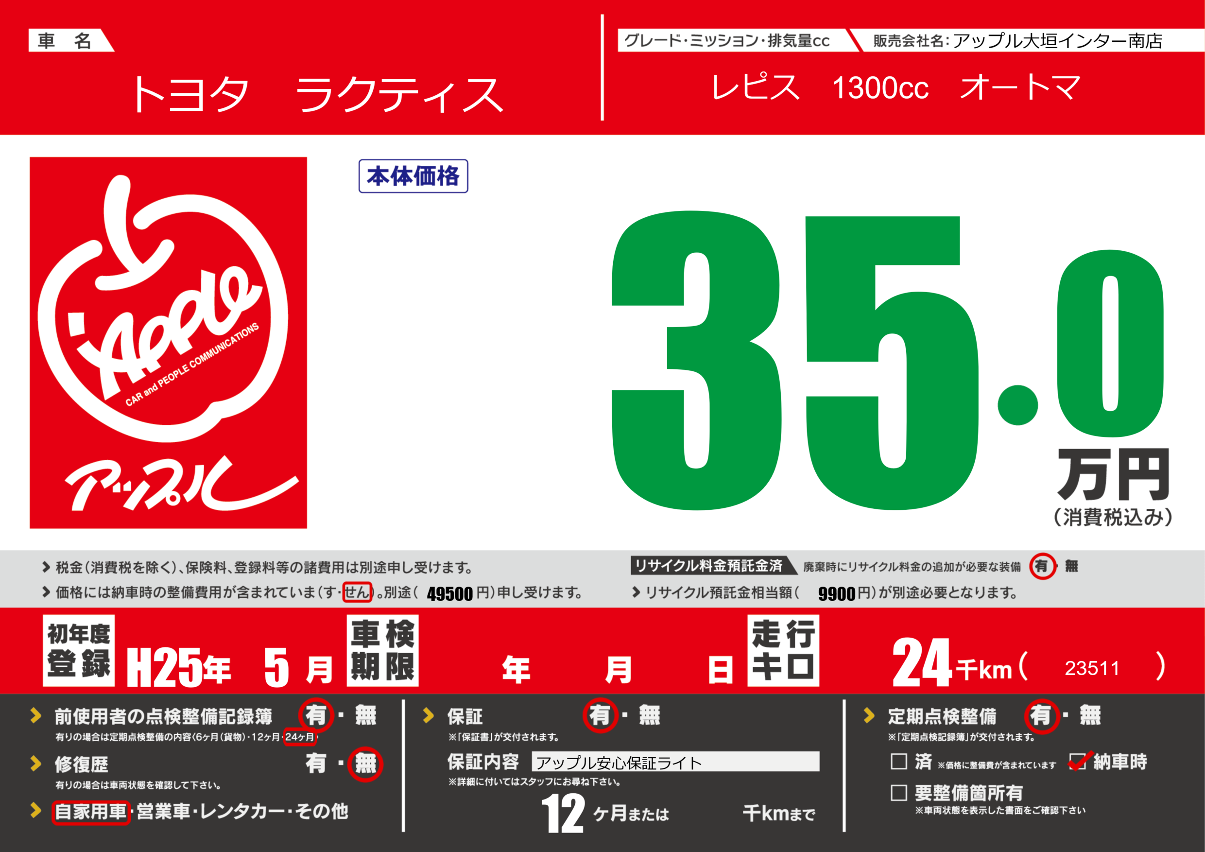保証付き 保証内容(アップル安心保証ライト) 12ヶ月または()千kmまで |