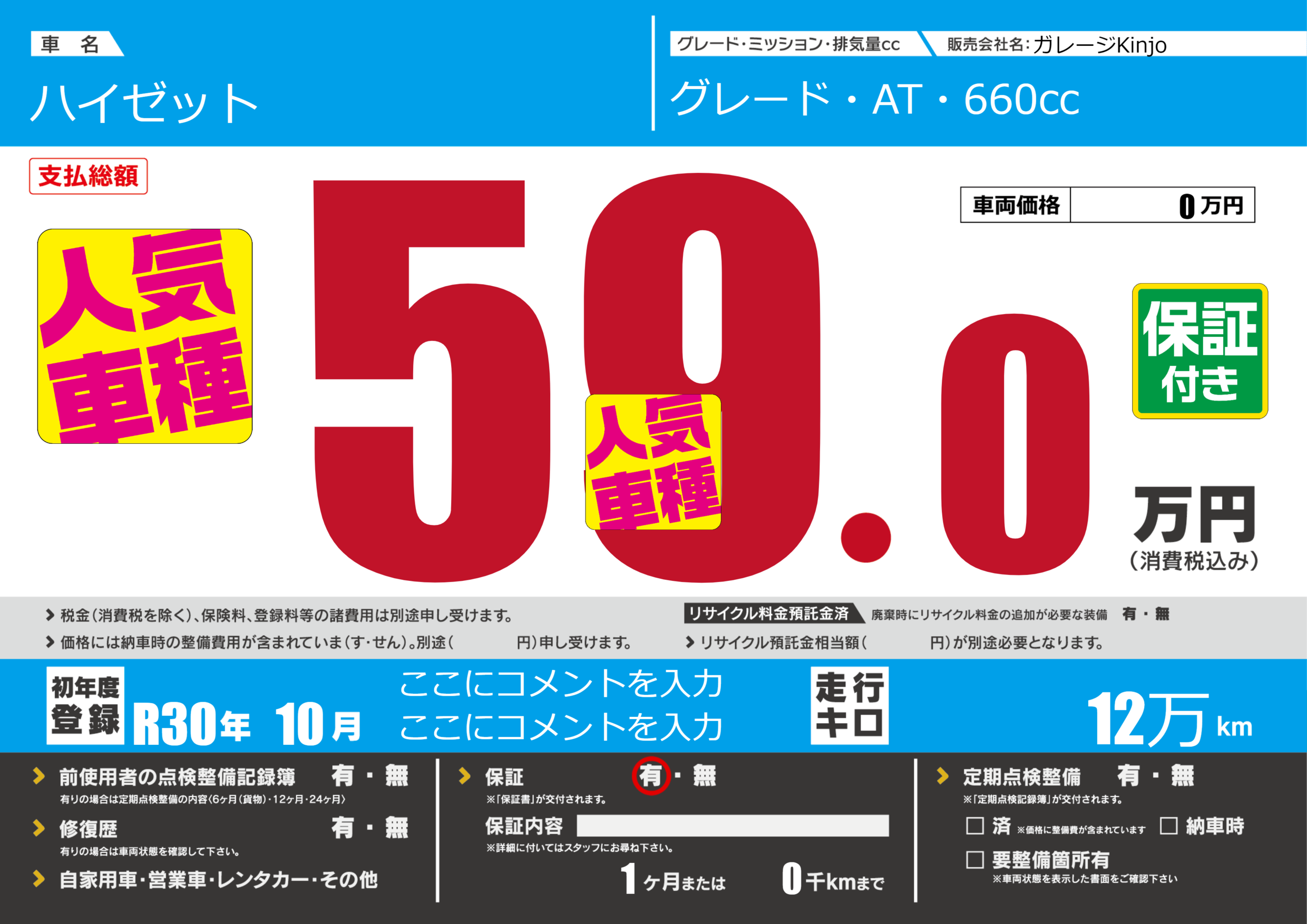 保証付き 保証内容(---) 1ヶ月または(0)千kmまで |