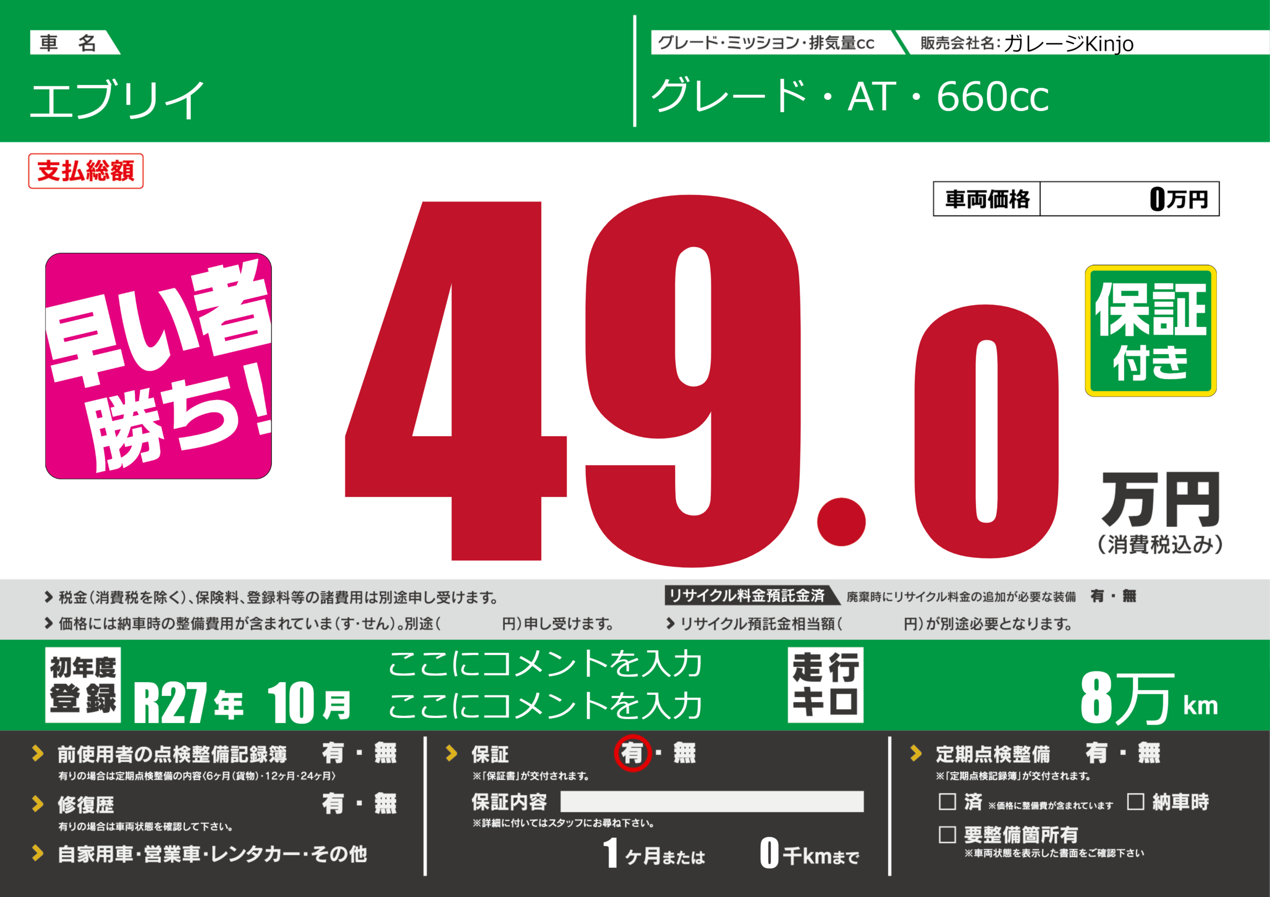 保証付き 保証内容(---) 1ヶ月または(0)千kmまで |