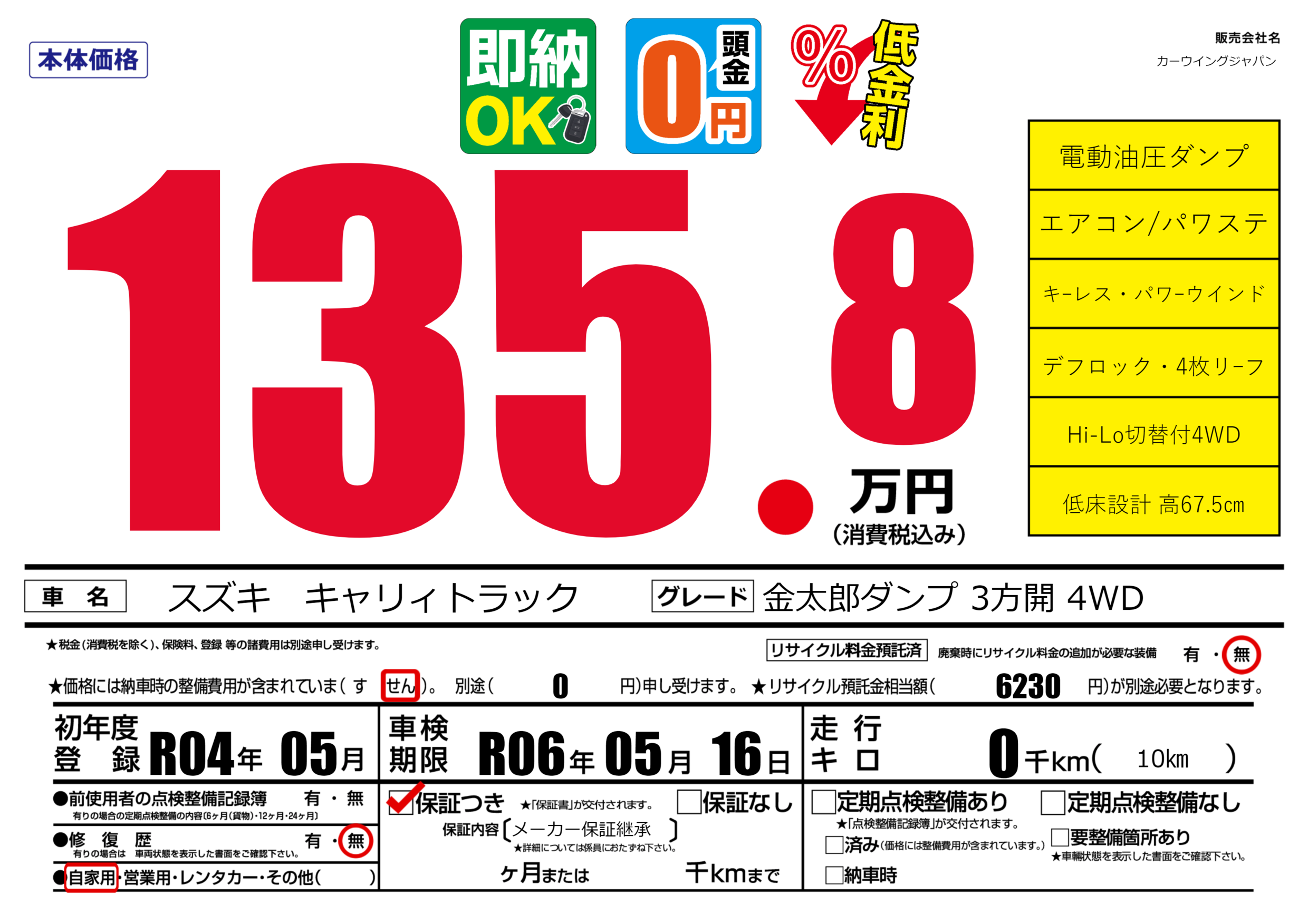 | 車名 | スズキ キャリィトラック | グレード ミッション 排気量 |