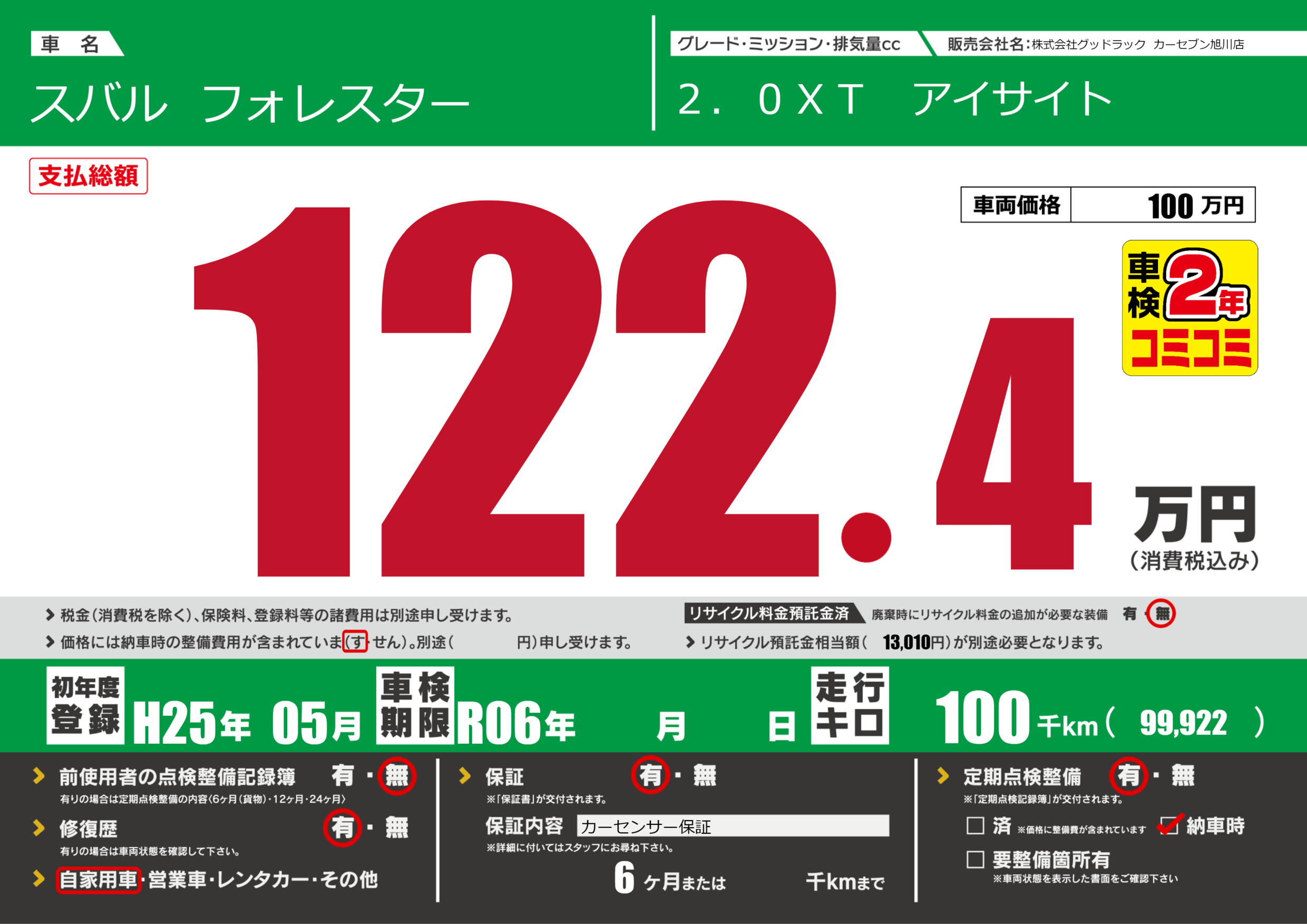 | 車名 | スバル フォレスター | グレード ミッション 排気量 |