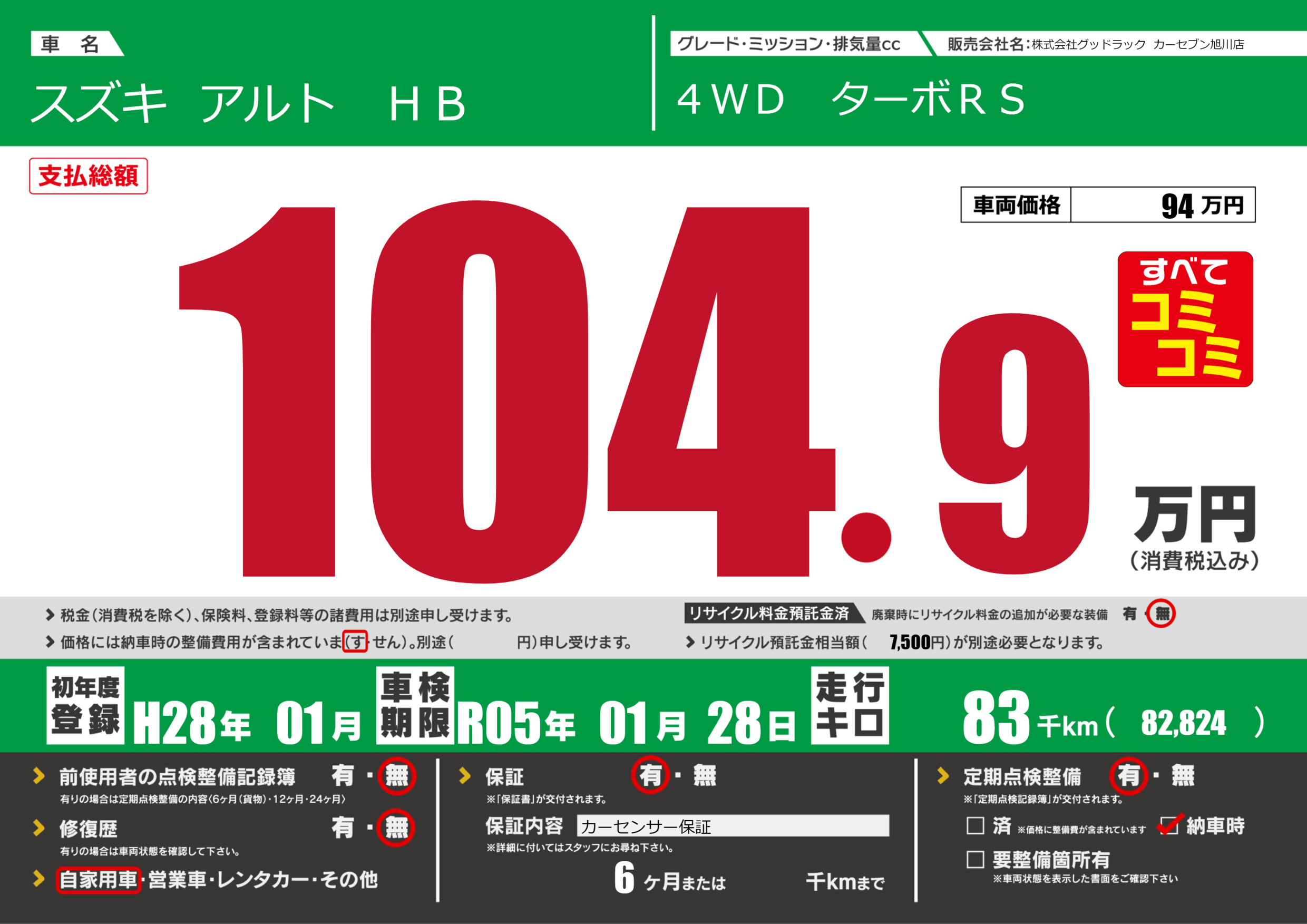 | 車名 | スズキ アルト HB | グレード ミッション 排気量 |