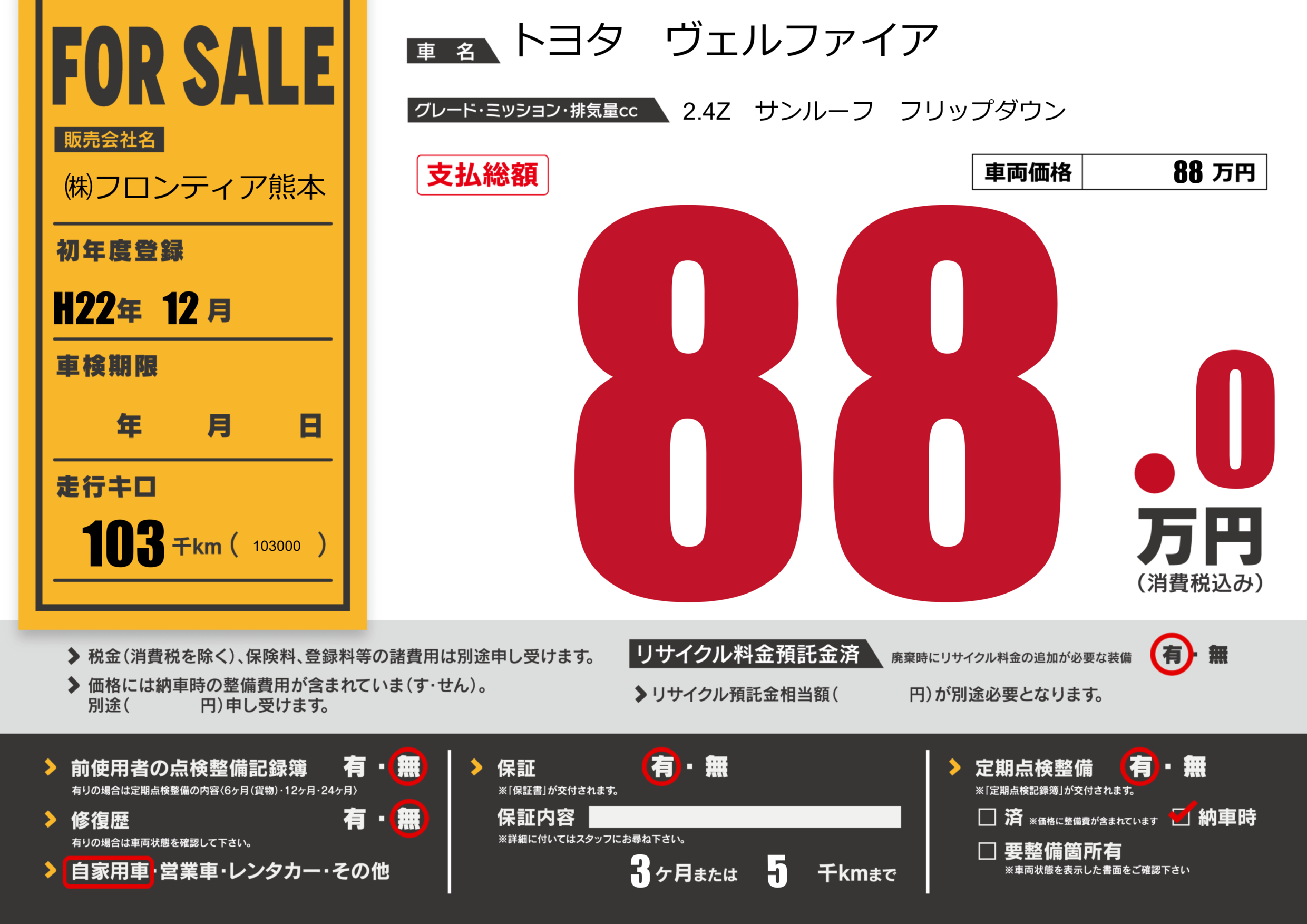 | 車名 | トヨタ ヴェルファイア | グレード ミッション 排気量 |